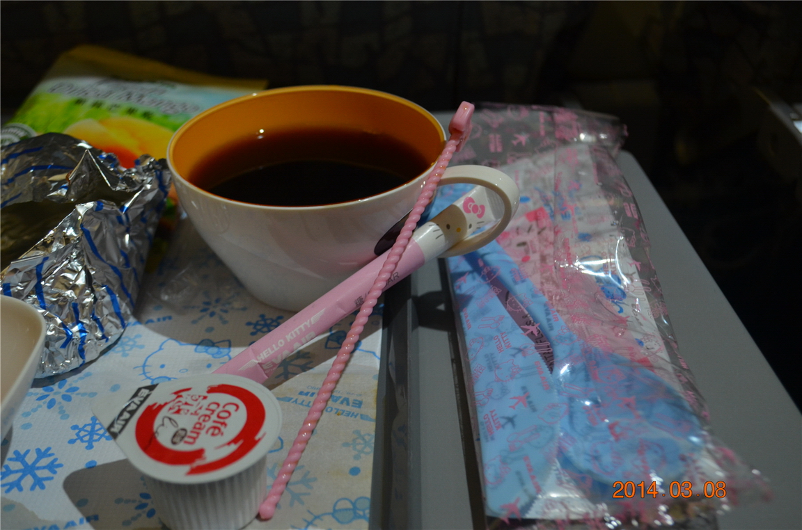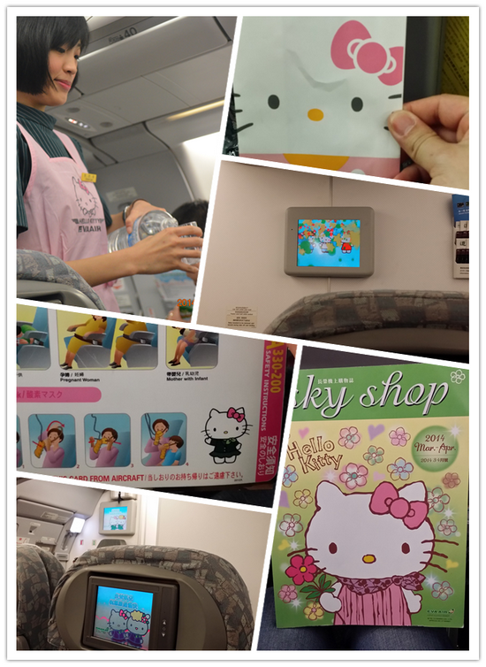 很遗憾的是,坐的不是真正的HelloKitty主题飞机,应该是内部临时改装的,不过这也是买机票的时候就通知了的,真正的HelloKitty主题飞机只有一架,其他的都是内部改装。但是还是可以看到,所有的东西都是有HelloKitty风格的。但是洗手间和飞机外面的涂装不是HelloKitty的。