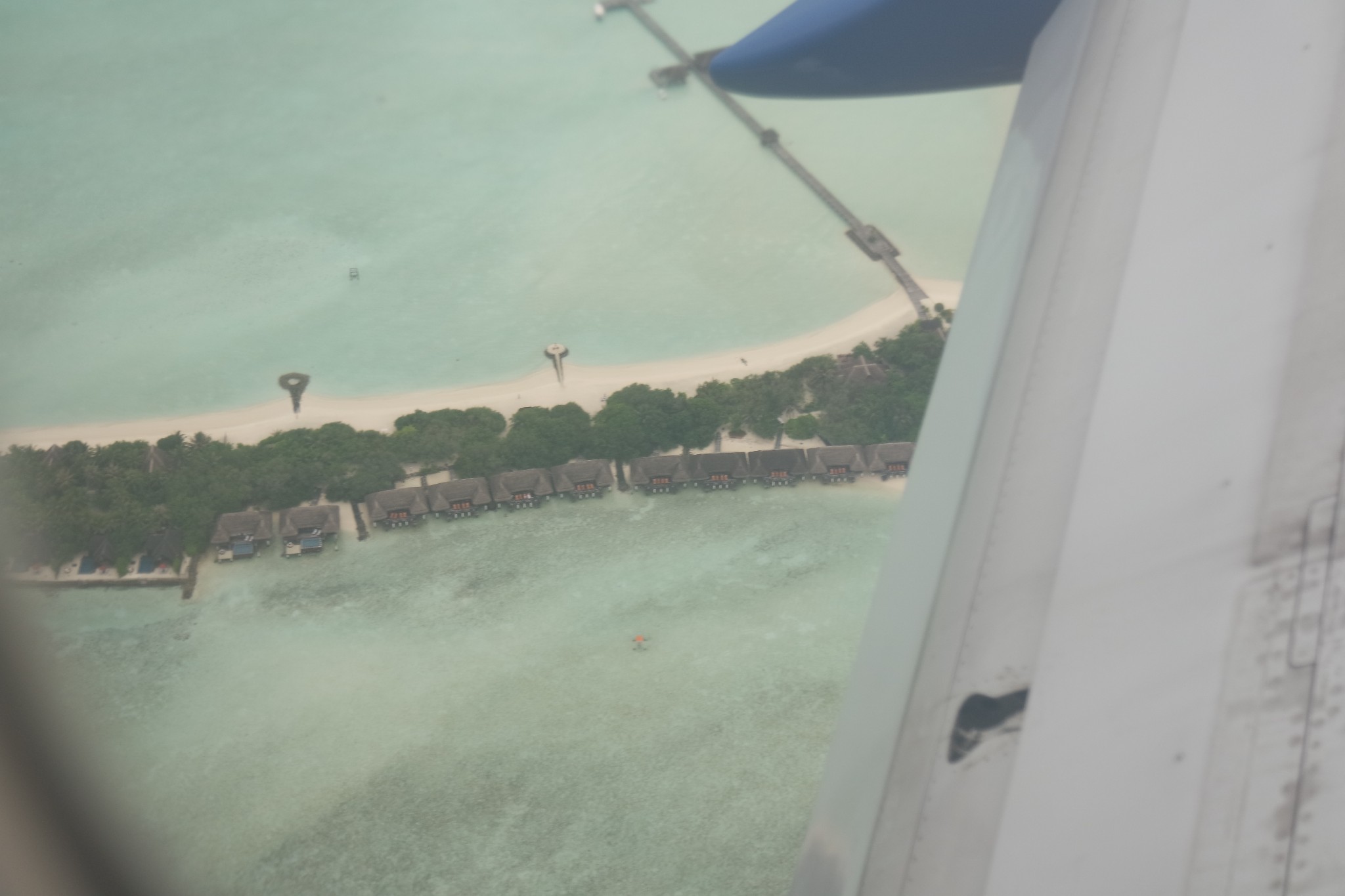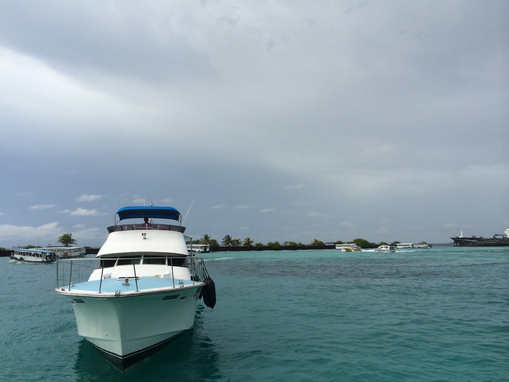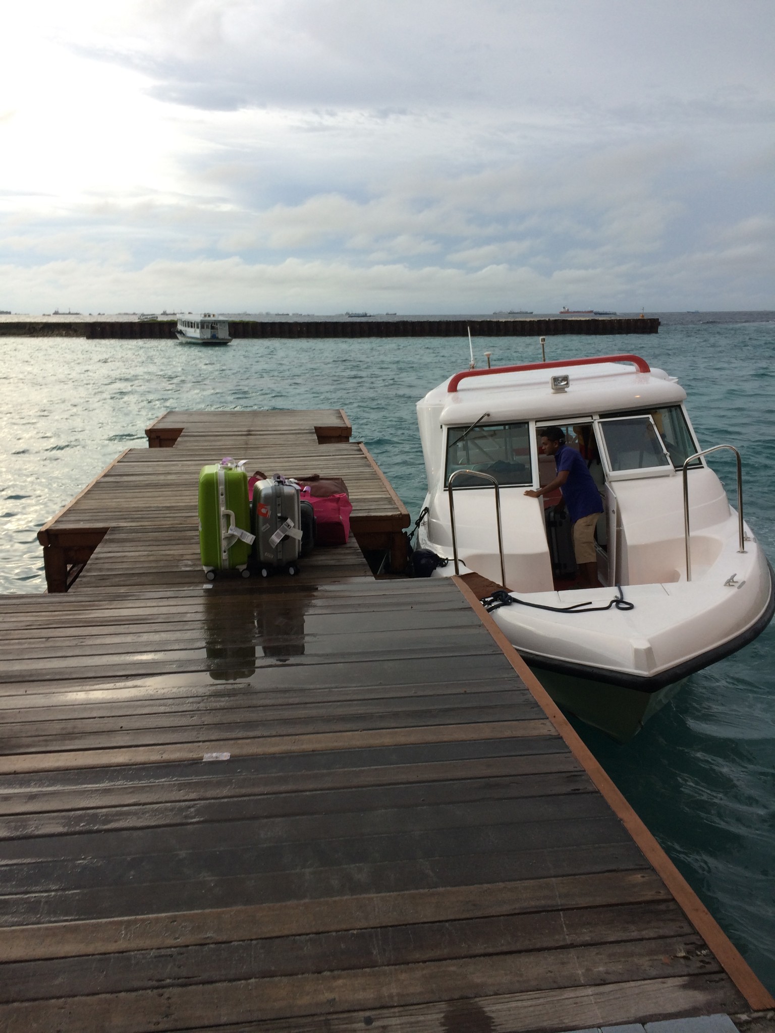 在飞机折腾了将近十三个小时,终于到马累机场了,那里天也是阴阴的,刚下过雨。机场出来之后又很多一个个小的柜台,都是马尔代夫各个岛屿的柜台,找到自己的岛就行了,等人多点之后,他们就会安排上快艇,因为我们是普通经济岛,所以相对于其他岛的快艇来说要小一点,舒适度也不好。在马累机场来回都没有看到水飞,不知道是不是因为天气不好,又快天黑了,所以不飞了。我们当天飞机晚班,估计坐水飞上岛的人要在马累停留一天了,听说水飞晚上是不飞的。