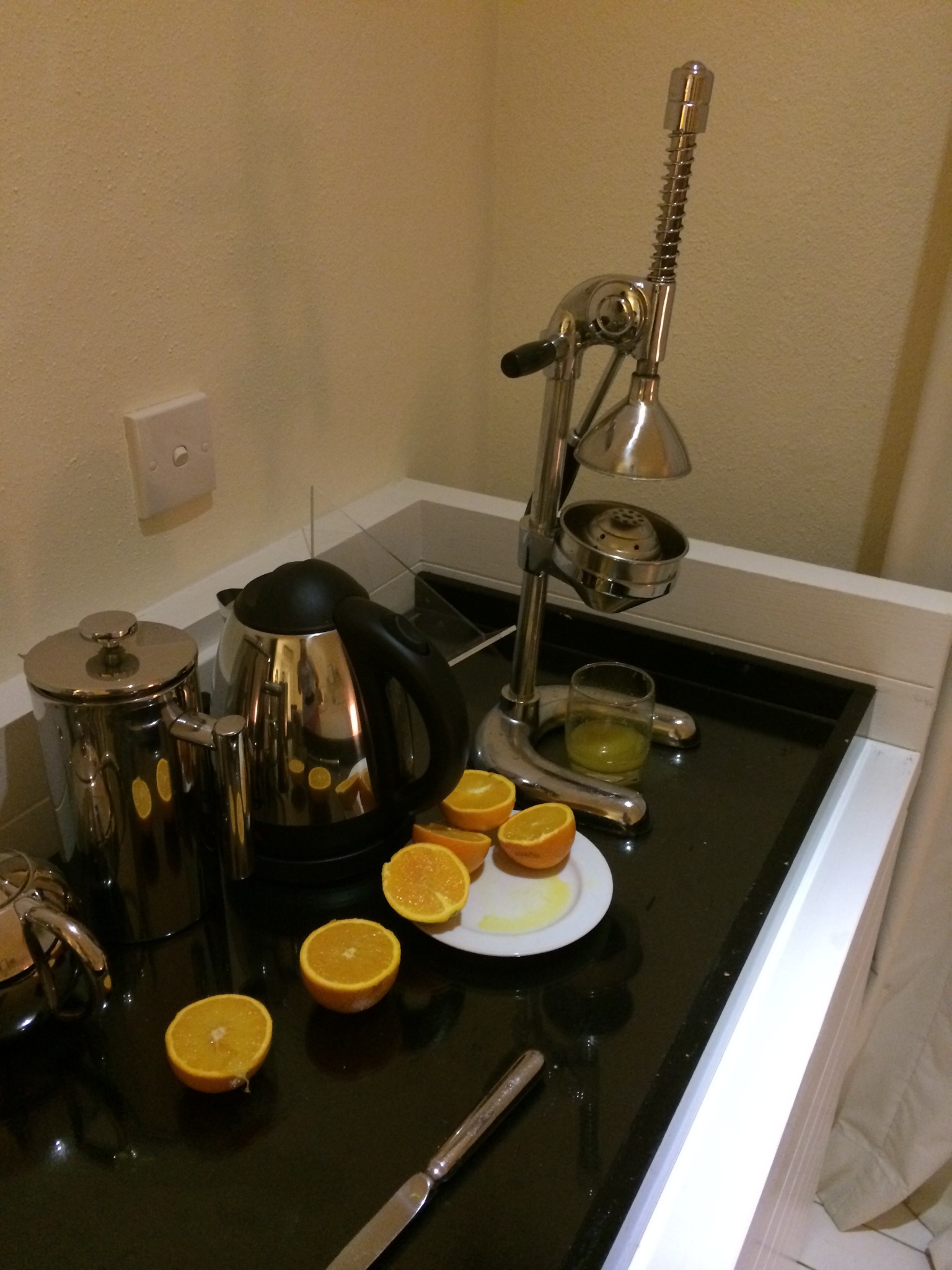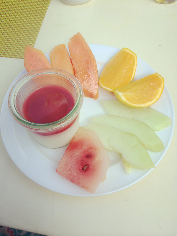 房间就是宜家风格,普通,简单,干净,房间每天有两大瓶免费水和六个橙子,水不是很新鲜,不是当天的,还有榨汁的工具,还有热巧克力,咖啡,茶包等,冰箱里的牛奶是免费的。但是房间里就一个杯子,牛奶也是只有一盒,这很不合理,我们也懒得和他们说。浴室是露天的,沐浴露洗发水护发素什么的都有。我们预定的时候有申请蜜月布置的,但是房间里没有,而且应该是大床房,他们给了我们双床,我们先发邮件跟携程反应,然后去吃晚饭的时候也跟酒店反应了。