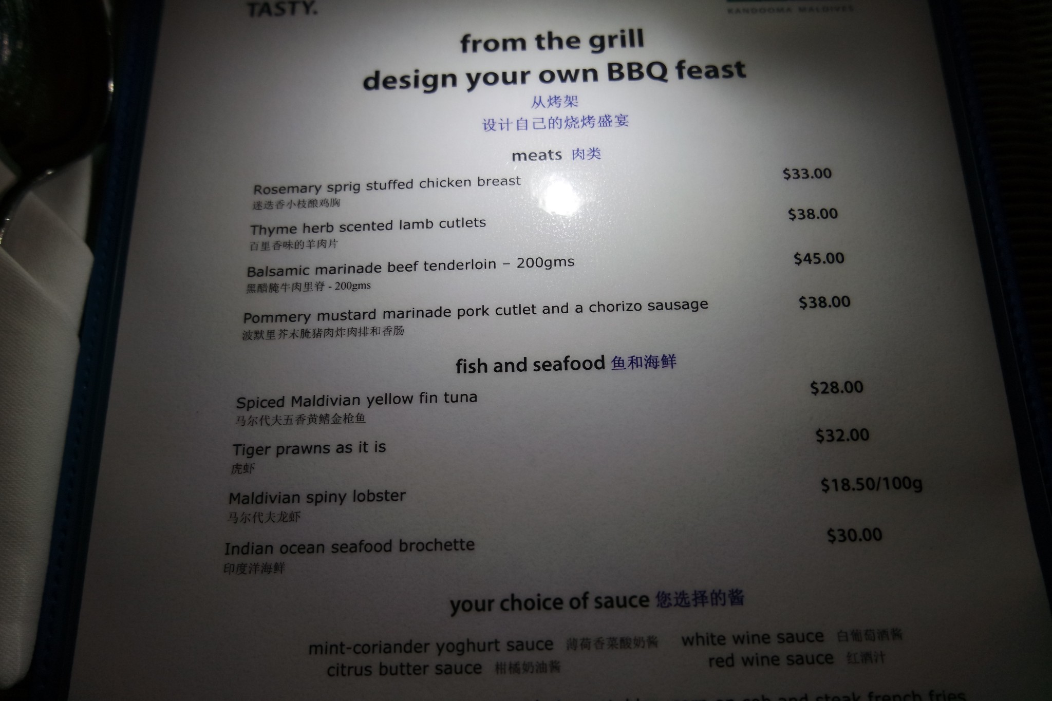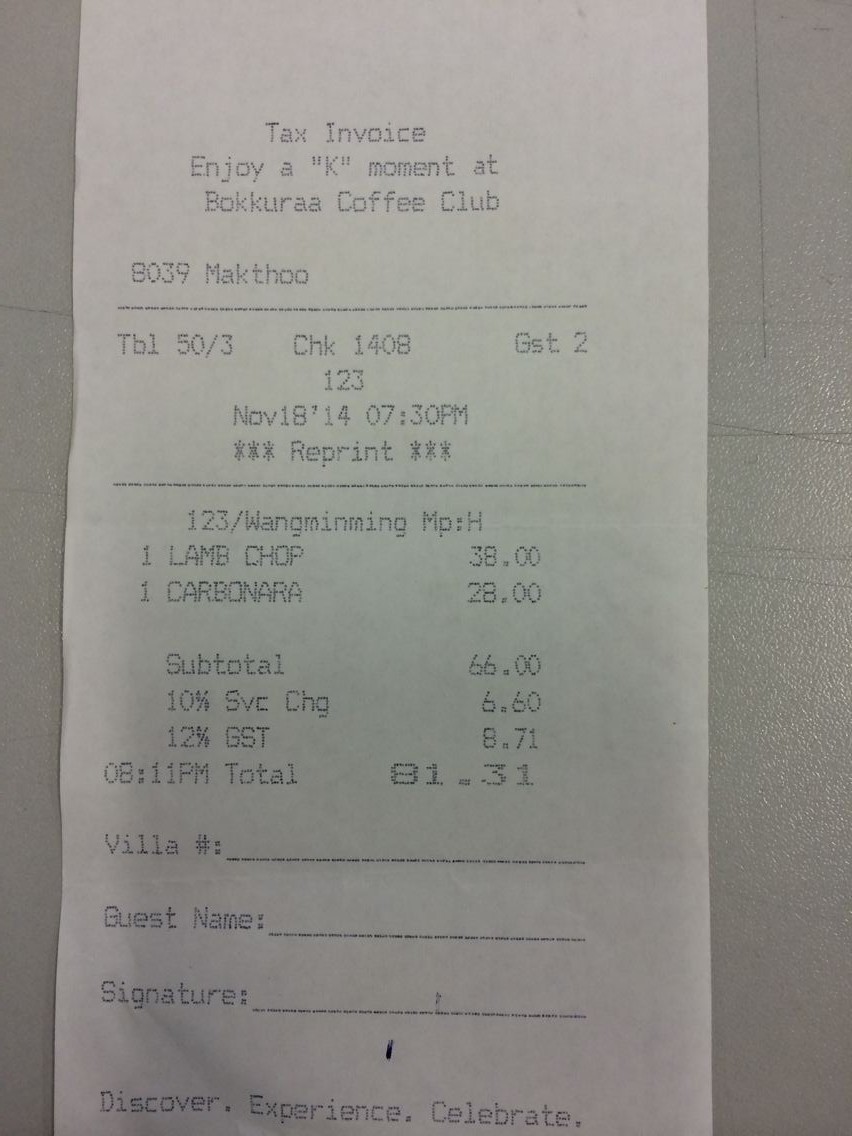 之前看游记,大家说泳池旁边的餐厅最便宜,我们就到那里去点了一份奶油通心粉,一份羊排意面,不点饮料他们也会免费给一瓶水,和房间的一样。通心粉奶油味很足,很赞,羊排意面也很好,有三块羊排,意面是番茄味的~能吃的很饱,不过价格也不便宜,加上税两份就要500人民币。说来也真是的,偏偏从11月来时税涨价了,以前是10%+8%,现在要10%+12%,岛上的税真的太厉害了。吃完之后费用是记在房号里的,退房的时候会一起算,岛上任何消费一定要问他们拿张单子留底,退房的时候可以核对下,我们退房的时候就发现他们多收我们了,还好有单子留底。