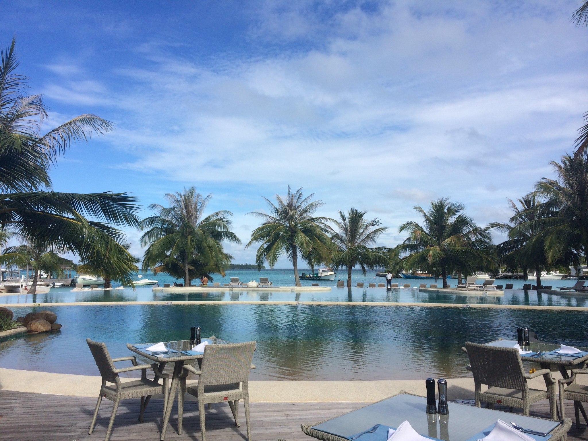 吃早餐的餐厅每天有两个中国服务员在,她们是专门负责招待客人的, 回答游客的问题,还有推荐游客去The Kitchen吃晚餐,那里是需要预约的。之前看游记就听说那里一流的风景三流的味道,所以没有接受他们的推荐。本来以为浮潜课程需要提前一天预约,没想到当天预约当天就能参加,所以吃完饭我们就去预约好了,那时候时间还早,就在岛上晃悠~