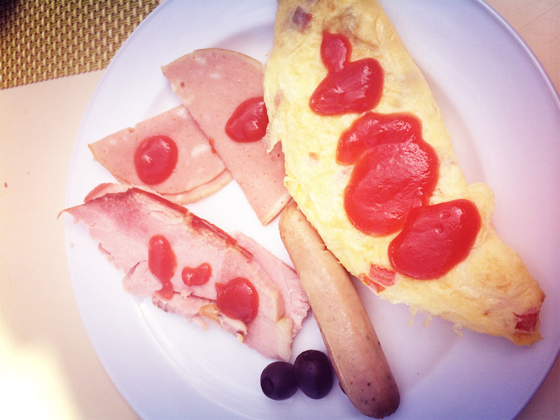 我们是只包早餐的,本来我准备早饭晚点吃,中午就不饿了,吃个晚饭就行了,我每天吃两顿就够了,阿三不够,男的胃口比较大一点,但是两个人的订餐必须一致,本来想帮阿三定三餐全包价的,所以我们一天去三次餐厅。早上醒来饿了就去吃早饭了,所以带的食物没吃多少都带回去了。