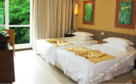 后三晚我们选择了住在远离闹市区的亚龙湾凯莱仙人掌度假酒店,这是一家历史比较悠久的酒店,房间非常多,处于二线海景位置,靠近蝴蝶谷,是亚龙湾最偏僻的一个星级酒店,酒店环境很好,不过内部设施较为陈旧,因为价格实惠,所以住的人非常多,酒店有自己的私家海滩,平均八分钟就有一辆电瓶车过去,三分钟就可抵达。我们住的山景房价格为450一晚。抵达之后才知道原来这个价格是不含早餐的,早餐的价格是80元一位,相当不划算,如果撇去早餐的话,这家酒店的性价比还是非常高的。另外,机场巴士也会停靠在这个酒店。