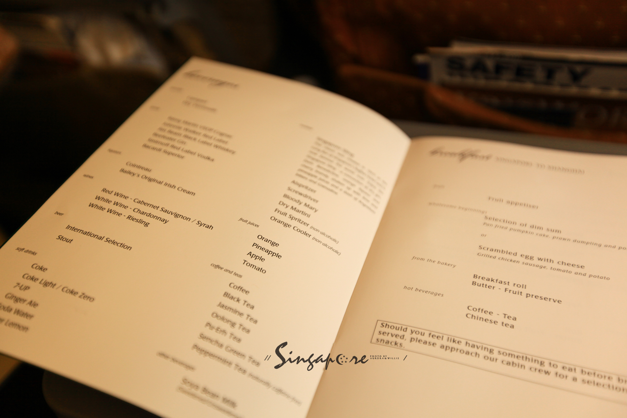 一上飞机,空姐就给我们发了菜单,除了几十种饮品外,还有中西两种早餐可选。