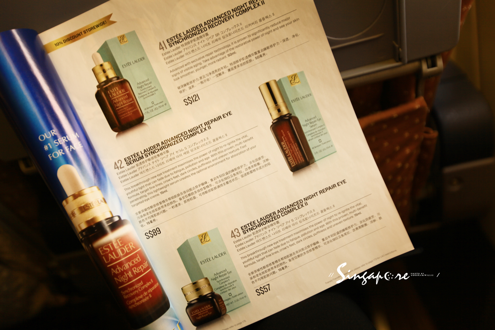 飞机上的雅诗兰黛简直实惠的令人叹为观止,ANR眼霜仅需57新元,再加上九折优惠,最后的价格不过才240RMB!简直刷新了历史新低,要知道之前一直以为卖的最便宜的日上免税店售价是330RMB呢。鉴于我前面的姑娘一口气买了三瓶,到我的时候已经没有库存了!好在回程我还有一次机会,虽然大多数人都会选择在回程飞机上再购物,但个别很热门的商品建议还是早点下手为妙哦。