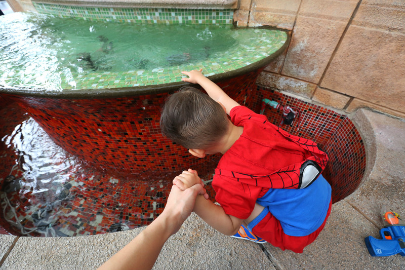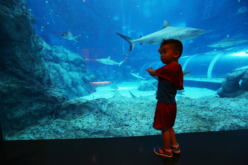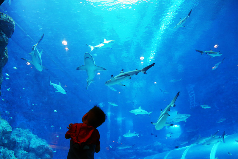 总是觉得小朋友身体里装着一个无限的马达,清晨开始启动,一直到夜晚睡着,现在中午有时候都不停下来,幸好老妈也以精力无限著称,但是在小小兽面前甘拜下风。在环球影城(/poi/10982.html)里面吃了午餐,然后回酒店取推车,早上退房时候我们把行李寄存在酒店,这晃晃荡荡一上午着实有些疲累,小朋友越大越爱撒娇,三十斤的大娃娃让老妈抱着,想着坐在推车里小小兽兴许还能睡一会儿,但是眼睛都不眨一下,小马达依旧动力无限,看时间已经下午,那就去海洋馆(/poi/7382073.html)看鱼吧!现在每次带小小兽去旅行,但凡动物园和海洋馆(/poi/7382073.html)我们都不会错过,小朋友喜爱小动物,尤其喜欢看鱼,但是这一下午我们几乎只看了鲨鱼,SEA海洋馆(/poi/7382073.html)的鲨鱼群十分壮观,小小兽完全被吸引,更没了睡意!