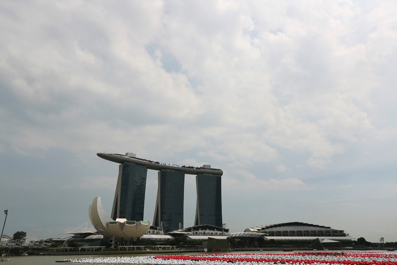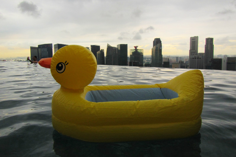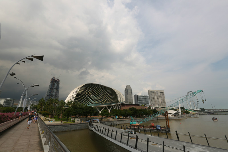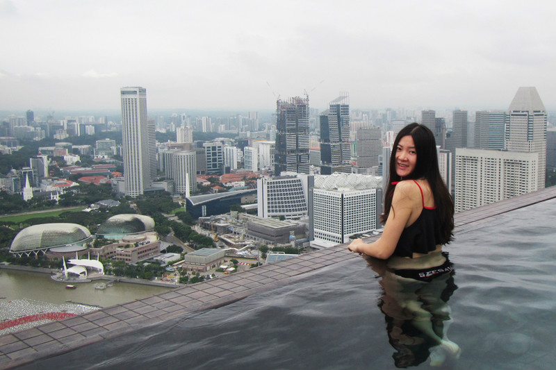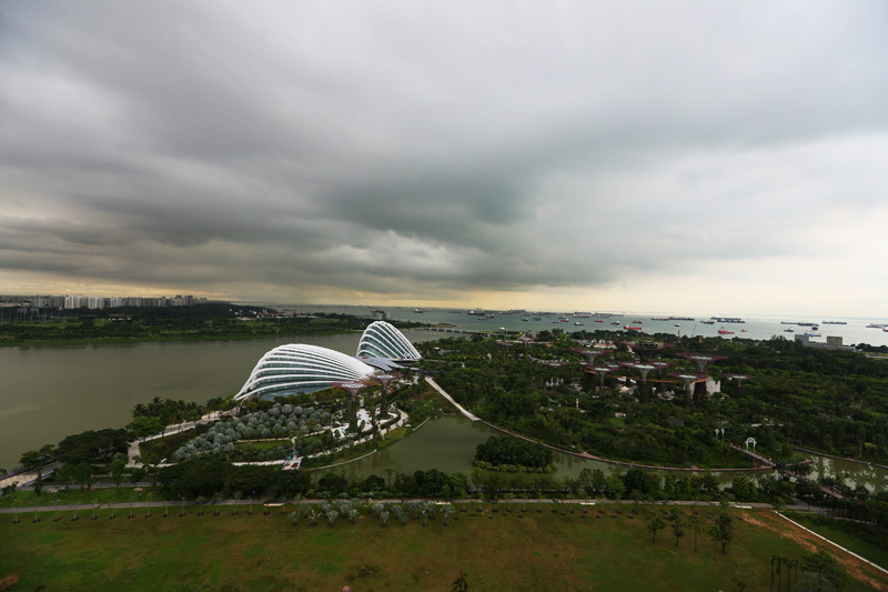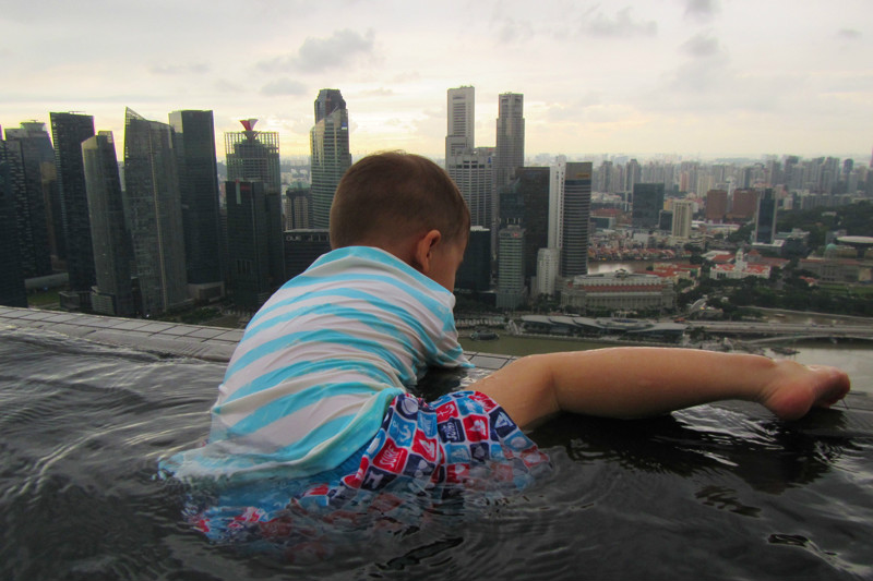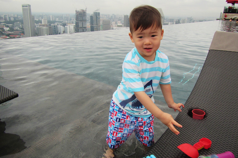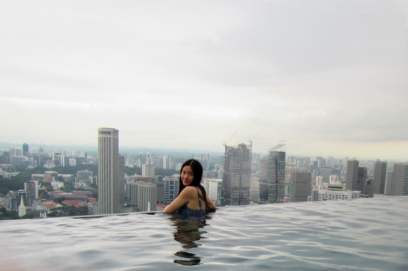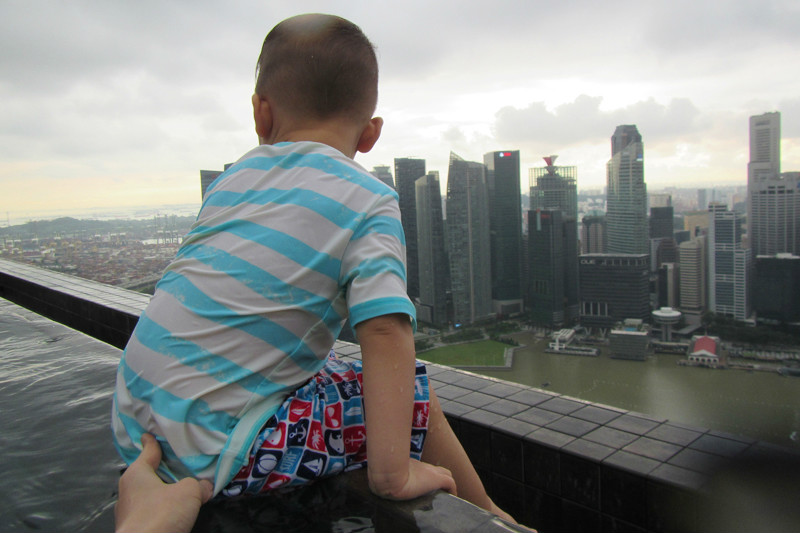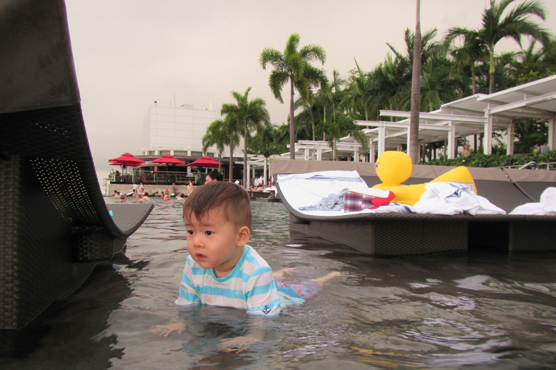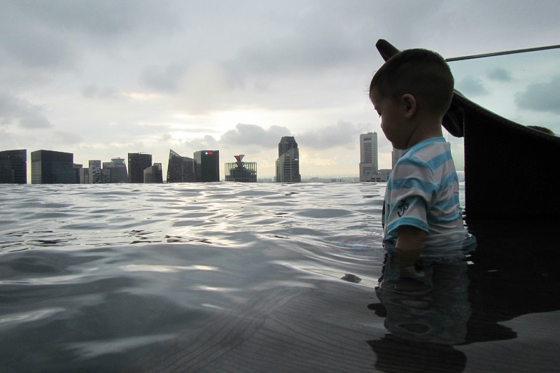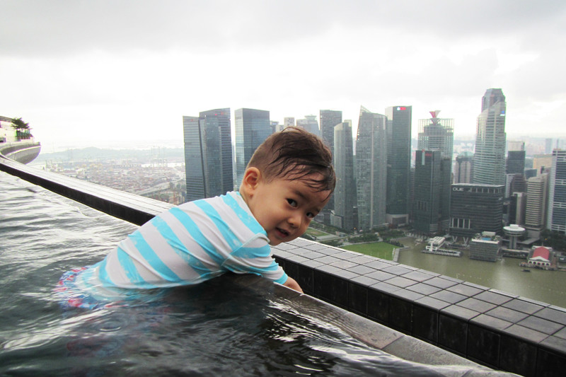 风景这边无限,像鸟儿跃上天空一般,现在我们是鱼,在空中游泳的鱼,在57层天顶俯瞰新加坡的城市景观,四年间新加坡的变化很大,小小的国家却无限包容,尤其是建筑,新加坡的建筑各异各样,富于特色,每一幢建筑都可以成为一处风景,滨海艺术中心,两颗巨大的榴莲,新加坡科学艺术博物馆,像一朵盛放在海上的莲花,还有金沙大酒店,航行在海上的大船!此时我们正乘坐着这艘大船在天空之上航行!就只这样泡在泳池里发发呆,看看风景都是一种享受,但可惜天公不作美,零散雷雨终于来了,小小兽舍不得离开,但是雨越下越大,怕他感冒,赶紧抱他回房间了,希望明天不会再有零散雷雨,至少零散雷雨不要在降落到金沙上空。