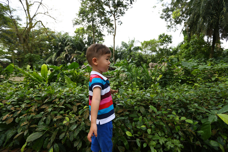 我一向自诩自己还算是个比较仔细的妈妈,对于小小兽的一切都考虑得比较周到,但是今天犯了个大错误!我居然没有带上防蚊虫喷雾和防蚊贴,一并蚊虫叮咬膏也乖乖的在酒店的箱子里睡大觉,偌大的原始森林更是蚊虫完美的栖息地,今天估计都吃得比较满意,才进园区不久我就被咬了无数包,看了看小小兽貌似还好,但依旧决定不停留太长时间,直奔长颈鹿生活的河边!还远远的就看到长颈鹿长长的脖子伸向游客,正好是午餐时间,赶得太巧,买到最后一盒胡萝卜,小小兽好奇的想往前靠近,怯生生地举着一根胡萝卜,又紧张地缩回小手,这样一个庞然大物在眼前害怕也是理所当然的,最后小家伙鼓起勇气和我一起喂食,都能感觉的长颈鹿有力的大舌头一卷就将食物从我们手中卷走,小小兽迅速地再次缩回,然后又特别兴奋的略带着骄傲的语气告诉我“妈妈,我喂它吃胡萝卜了!”不管怎样,宝贝你都是妈妈心中最勇敢最勇敢的小英雄!陪我走天下!陪我一起实现梦想!没有人比你更勇敢!
