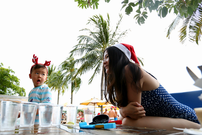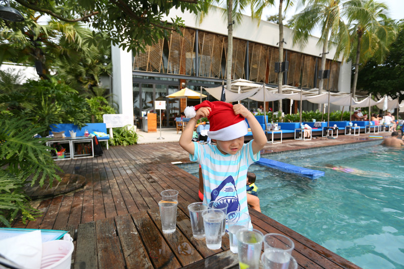 三十度的圣诞节,阳光,沙滩,比基尼,沙滩上,酒吧里,大海边,甚至是游泳池里,随处可见红色的圣诞帽,我和小小兽也提前准备了圣诞帽子和小鹿角,我喜欢入乡随俗,陌生的城市,没有人会在意你怎样,自己更不要太刻板自己的行为,合法合规的疯狂的旅行,享受其中的是自己,“你让别人愉快的程度往往决定着你人生的高度。”愉悦别人的前提首先是先愉悦自己,让自己快乐!沙滩上突然想起美妙的圣诞歌曲,大家都欢快的随之舞动起来,天!我真的遇见圣诞老人,雪白的胡子,胖胖的身体,他正向我们走过来,小小兽也看呆了,“妈妈,是圣诞老人吗?”