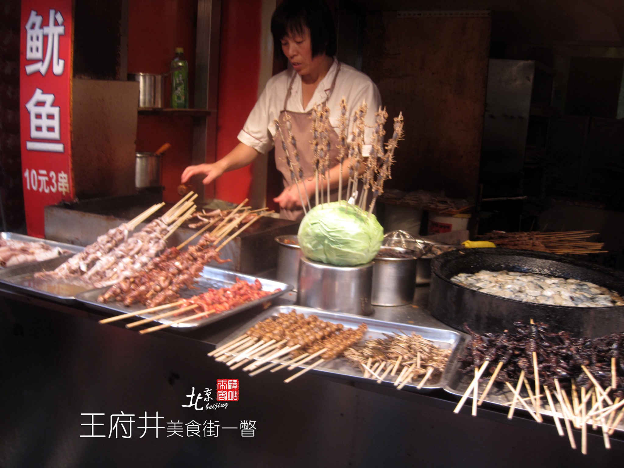 王府井步行街似乎并没有什么特色,和大多数城市的商业步行街一样,繁华、时尚。唯一的特色可能就是中间的一些北京特色的独立小商店,例如北京布鞋。从王府井步行街的一侧有一个小巷子,巷子里非常多人,基本上就是人贴着人走,想停下脚步都很难——这就是王府井的小吃街了。