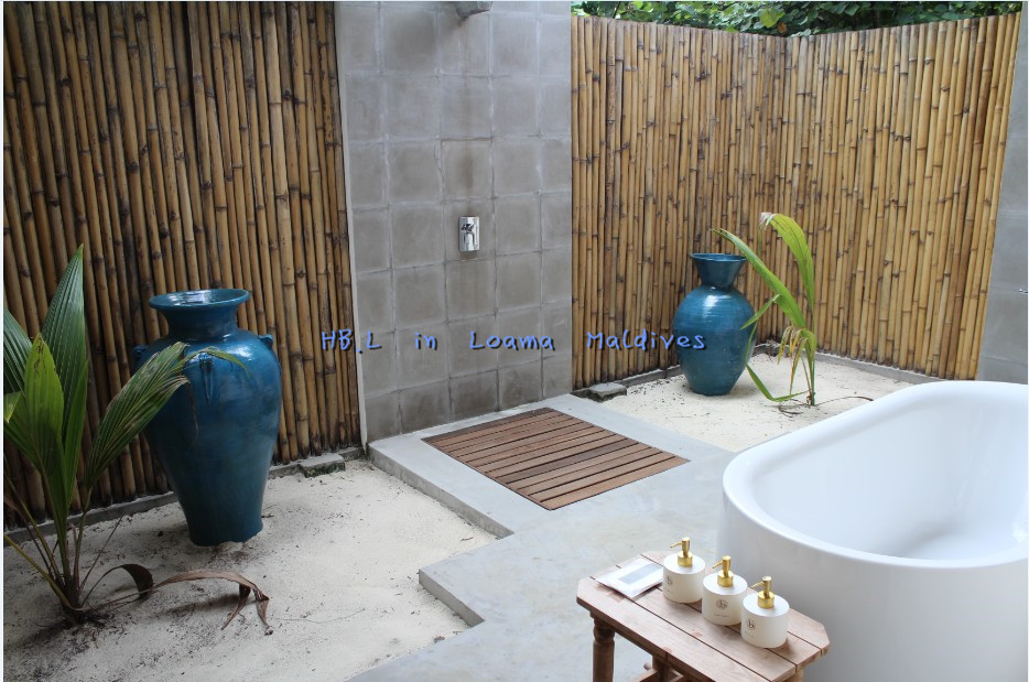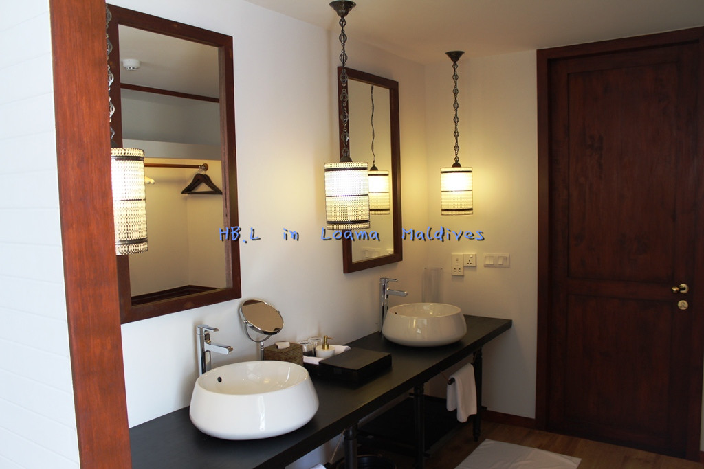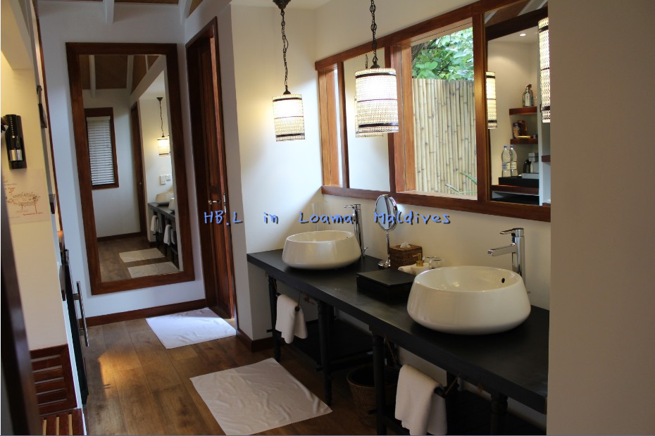 水屋其实总体上的设备和设计都和沙屋差不多的,区别浴室里面多了一张吊网床,这张网下面就是大海啊,恐高的人勿上啊,哈哈,不过呢,淋浴间就有点小,相对来说LZ喜欢沙屋的淋浴间。而且淋浴间和洗手间的地板他们都是特意用最原始的方式呈现,就是水泥地板,没有太豪华的瓷砖装饰。