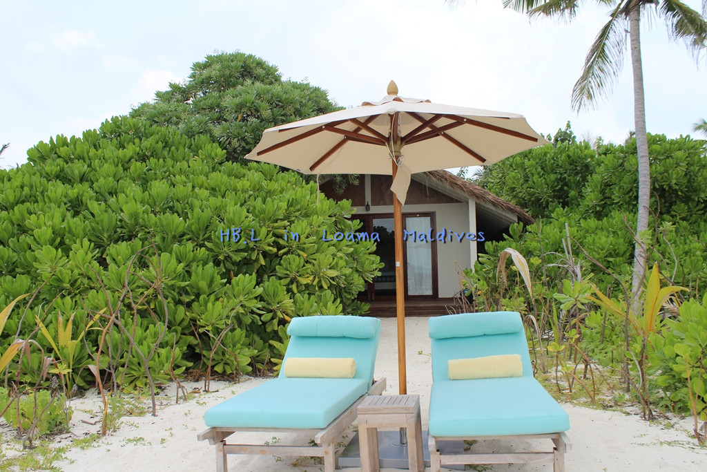 沙屋的话只有一个门,就是朝向大海那一面的门,太阳椅的话在灌木的尽头,离大海比较近,但是离门口有点距离,大白天的时候太阳太大,用到的几率为0。