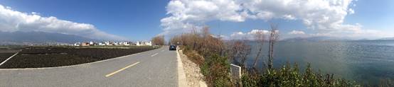 经过大理时我们打算顺道看看著名的洱海,于是便选择了在G5611(大丽高速)出口之后的第二个出口下高速,进入大理市区。把地图放大看发现沿着洱海有一条路叫环海西路,看着这条弯弯曲曲的小路也不知道能不能走车,于是便开过去试试,结果发现这真是一条绝佳的观景路。