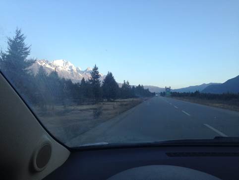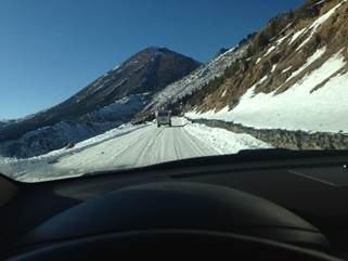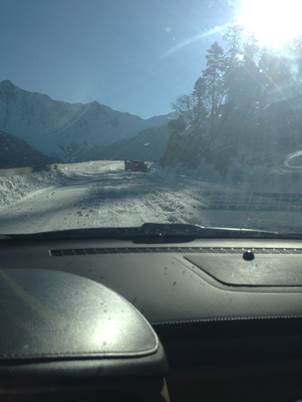 又开始出现冰雪路面!前方的客车司机下来换上了防滑链。我们也下车歇会。那辆前面卡在雪里的小轿车也已赶上,停在路边准备换上防滑链。走上去跟他们聊了几句发现他们居然是从湖南一路开过来的一家人,真的好厉害。我们也没带防滑链,就只能继续慢慢地往前开。