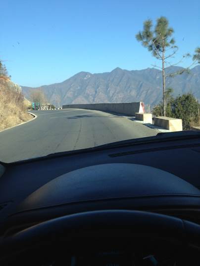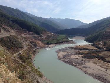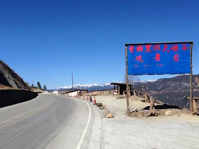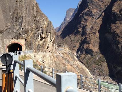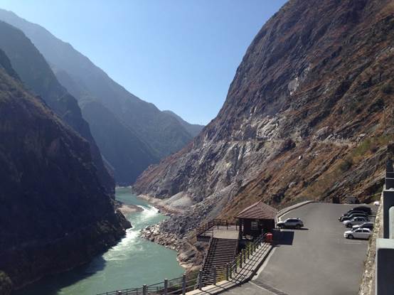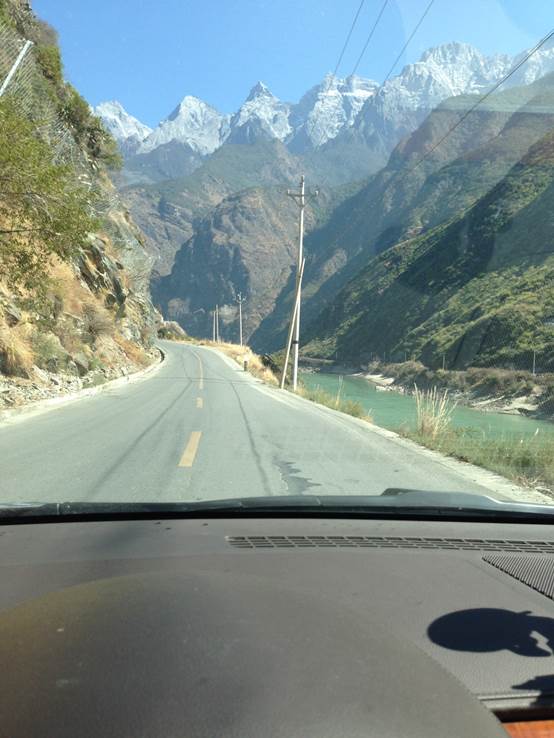 虎跳峡景区东环线,前方是雪山,右侧是一路随我们奔腾的长江