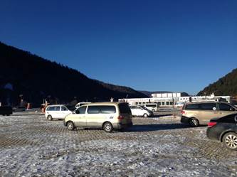 普达措景区门口稀稀散散地停着几辆车,淡季游客很少,但门票却跟夏天一样,138门票+120景区大巴费。不做大巴是不可能的,因为景区内还要开60多km。