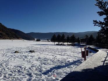 属都湖。到处白雪茫茫,栈道和湖面都结冰了,与夏天的景色截然不同。
