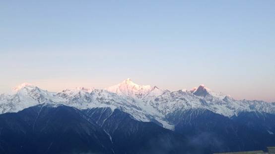 到达雾浓顶观景台,梅里雪山(/poi/6327930.html)尽收眼底。此时已近晚上7点,再等一会就可以看到日落了。最右是海拔6740m的卡瓦博格峰。