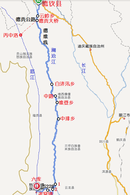 由于明永冰川去不了,雨崩村花的时间又太长,我们决定离开梅里雪山(/poi/6327930.html)去云南西南的腾冲瑞丽芒市。到腾冲有两种选择,一种是原路返回,走G214到香格里拉,丽江,再走高速(G5611)到大理,然后再走G56到腾冲;另一种就是沿着澜沧江走德维线上S228到六库,随后沿着怒江一路开到G56走高速(G56+S10)到腾冲。由于前一天被G214冰雪路面折腾的够呛,又想换换风景,我们便选择了后者,虽然时间可能会更长,路况也未知。