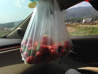 路边有很多草莓大棚,在路边买了这一大袋新鲜的草莓只要十块钱!