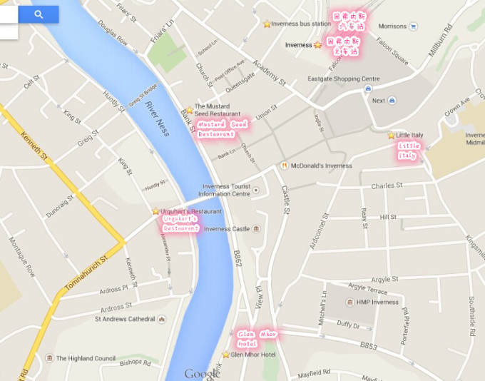 图片是最能说明问题嗒哈哈,下面的地图是俺们在因弗内斯的活动范围。。。距离都不远的,汽车站到Glen Mhor Hotel(所住旅馆)也就撑死了20分钟腿着儿的距离。。。咱两天吃饭的馆子也都在这两个之间,很方便嗒,真心不用坐车。。。
