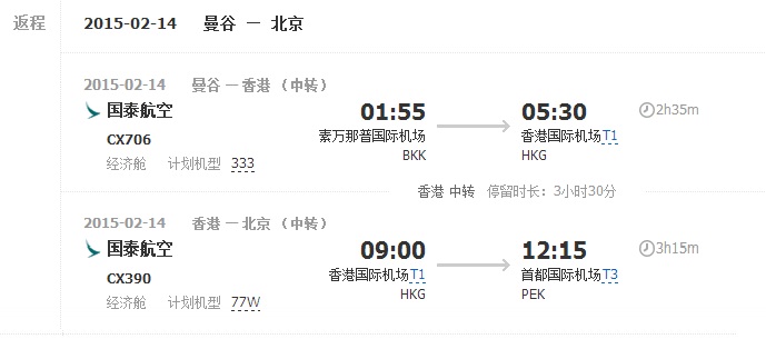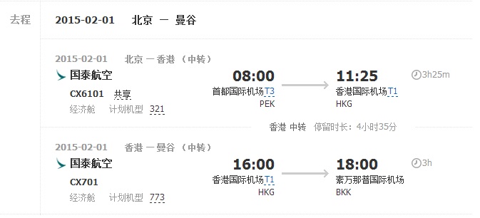 如果从北京直飞曼谷或者清迈,假期的成人往返价格大概是5000左右,想想我们时间上也不着急,能省则省,便觉得购买中转机票,机票后面备注有+1标识的是要在中转城市住宿一晚,比如1号出发,2号到达目的地,我个人认为这种是不可取的,一个是人人会比较疲倦,再有住宿一晚的费用和交通费加入成本,也就不太划算了!经过多方比较(包括携程、去哪儿),最终我是在携程购买了北京往返曼谷中转香港,早上出发,当日下午可以到达曼谷的机票,