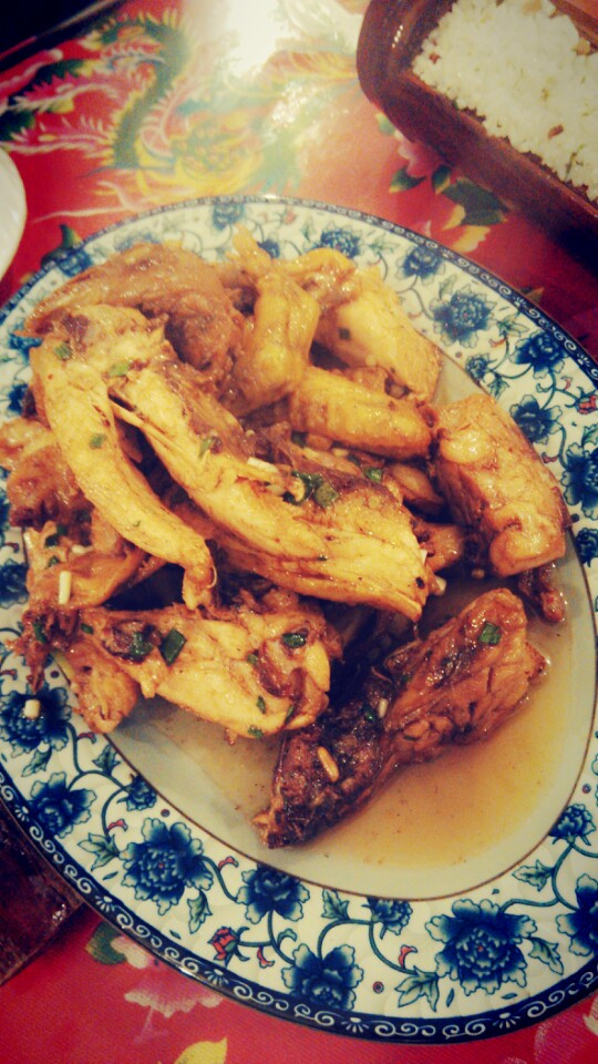 按照我们想象中,叫花鸡应该是整只上来我们自己撕着吃的。原来是大厨切开炒好才端上来的,难怪让我们等了那么久。竹筒饭也蛮赞的,上面放了韭苗,很香,很有小时候炒饭的那种熟悉的味道,好呲。