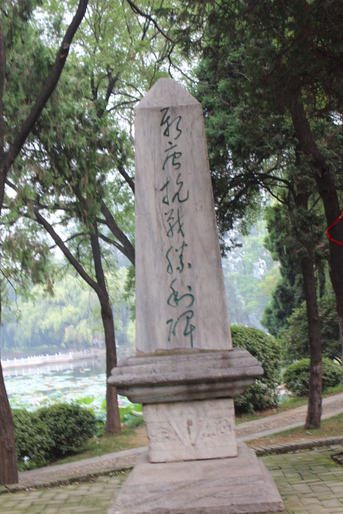 入门看到这样一块碑,“新唐抗战胜利碑”?一侧写着汤恩伯和孙连仲的名字,另一侧刻着于右任的一首诗,这是什么碑?看来应该和国民党抗战有关。话说重庆解放碑的介绍说是全中国境内唯一的一座抗战胜利纪功碑,那么这一刻碑的由来又有什么故事?回头要去查查。。。