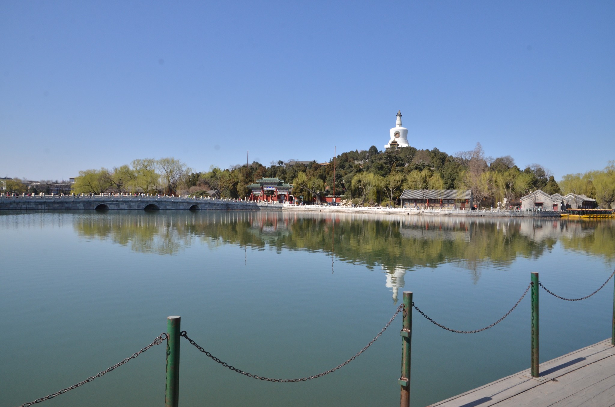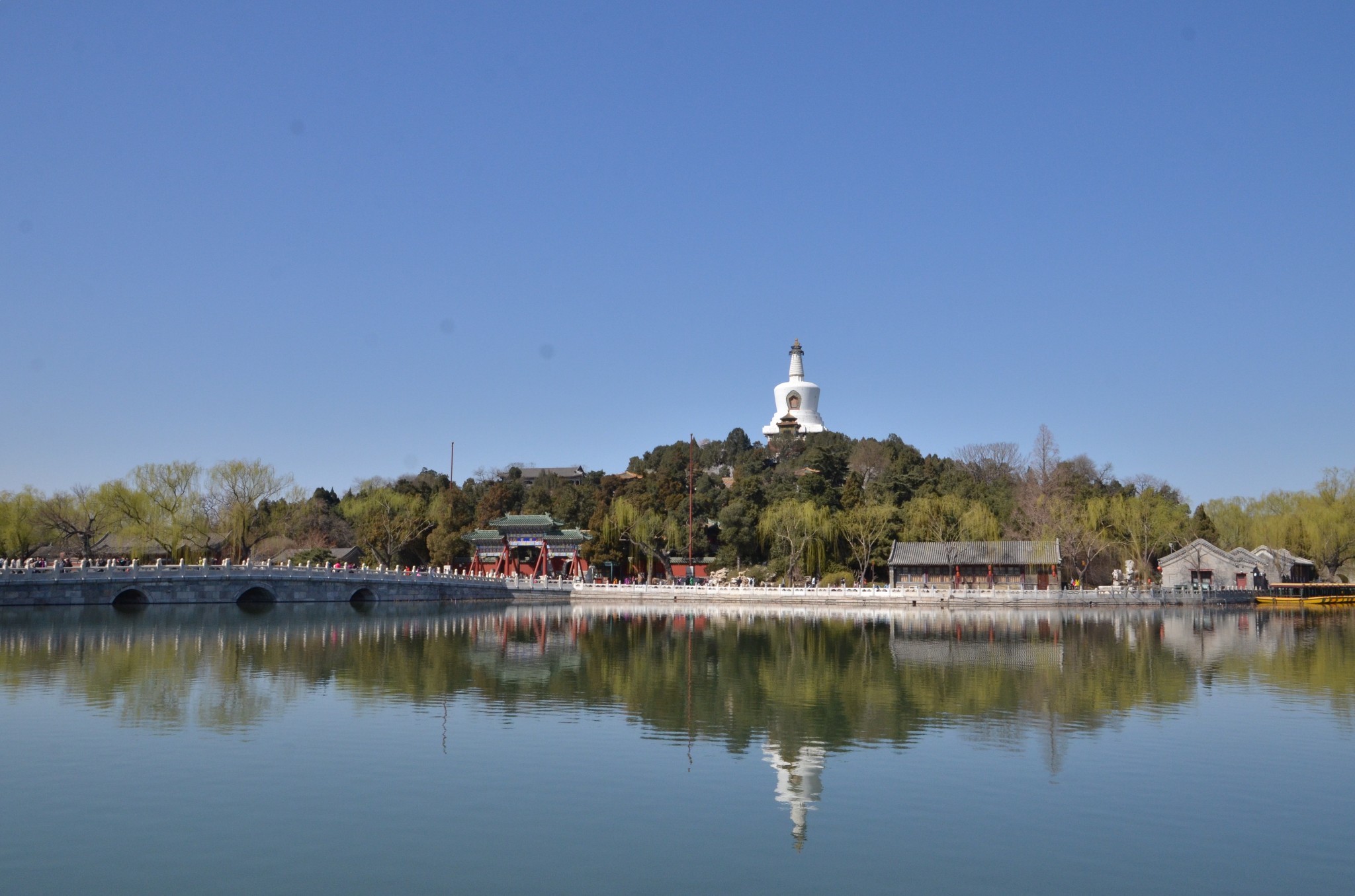 海面倒映着美丽的白塔 四面环绕着绿树红墙