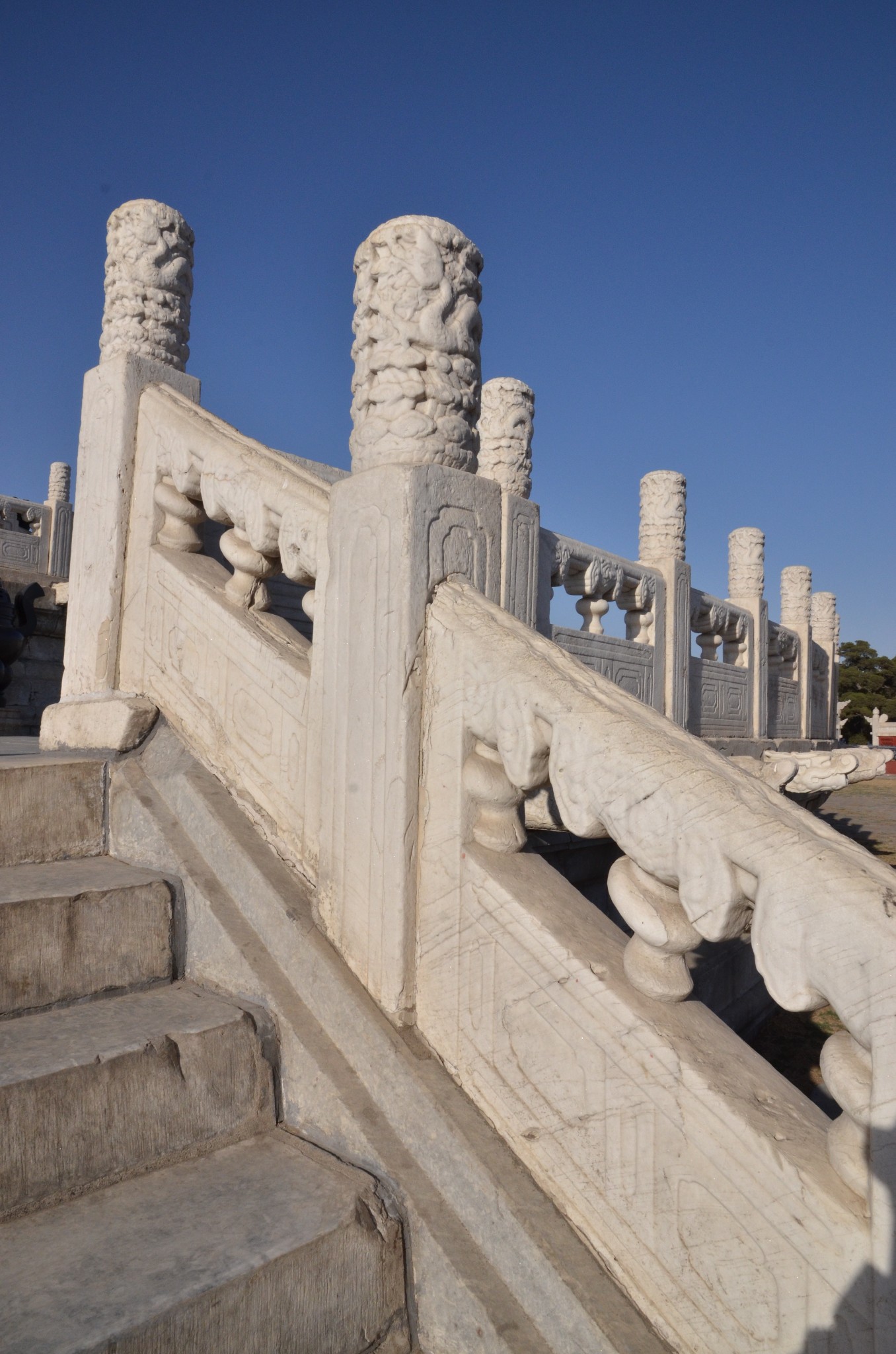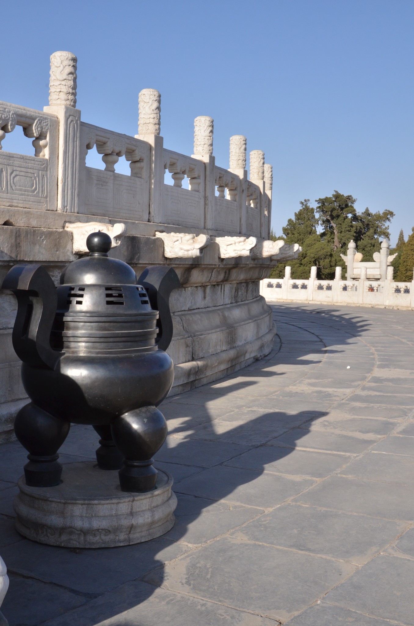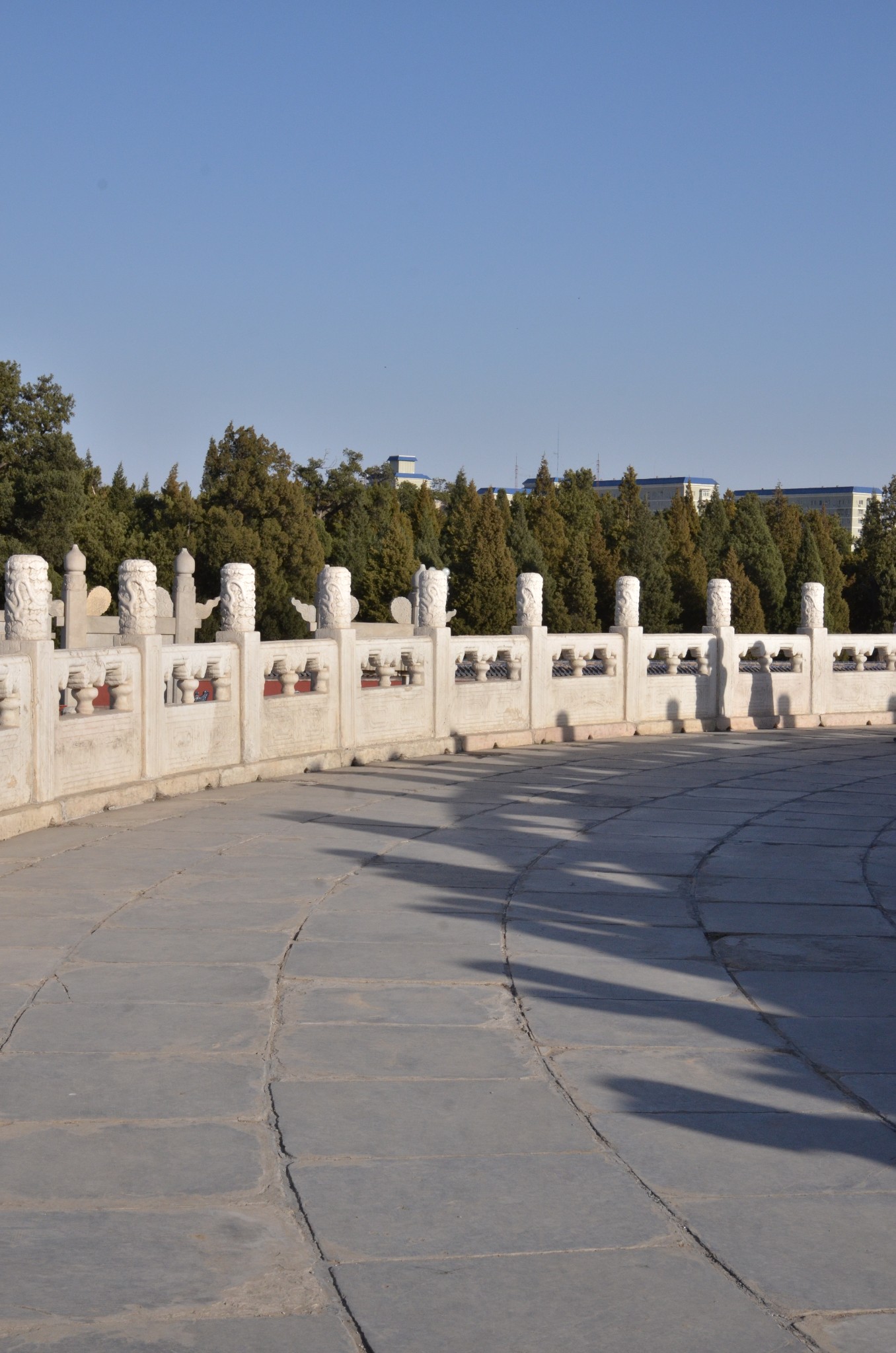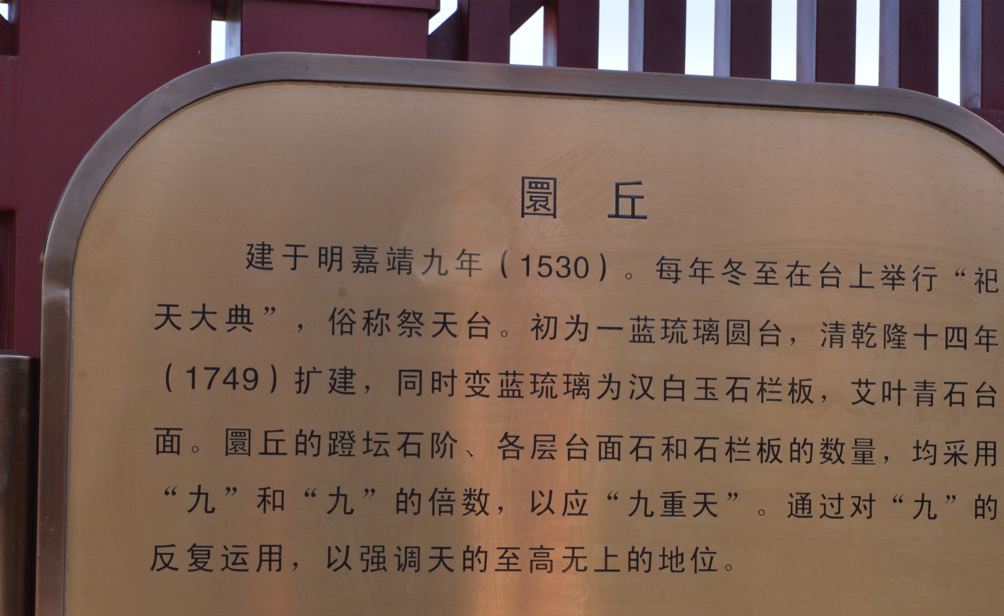 圜丘坛又称祭天台、拜天台、祭台,是一座露天的三层圆形石坛,为皇帝冬至祭天的地方,始建于明嘉靖九年(1530年),清乾隆十四年(1749年)扩建。坛周长534米,坛高5.2米,分上、中、下三层,各层栏板望柱及台阶数目均用阳数(又称“天数”,即九的倍数),符"九五"之尊。坛面用艾叶青石砌就。坛面除中心石是圆形外,外围各圈均为扇面形,数目也是阳数。每层都有汉白玉栏板望柱,均为9的倍数。顶层中心的圆形石板叫做太阳石或者天心石,站在其上呼喊或敲击,声波会被近旁的栏板反射,形成显着的回音。
