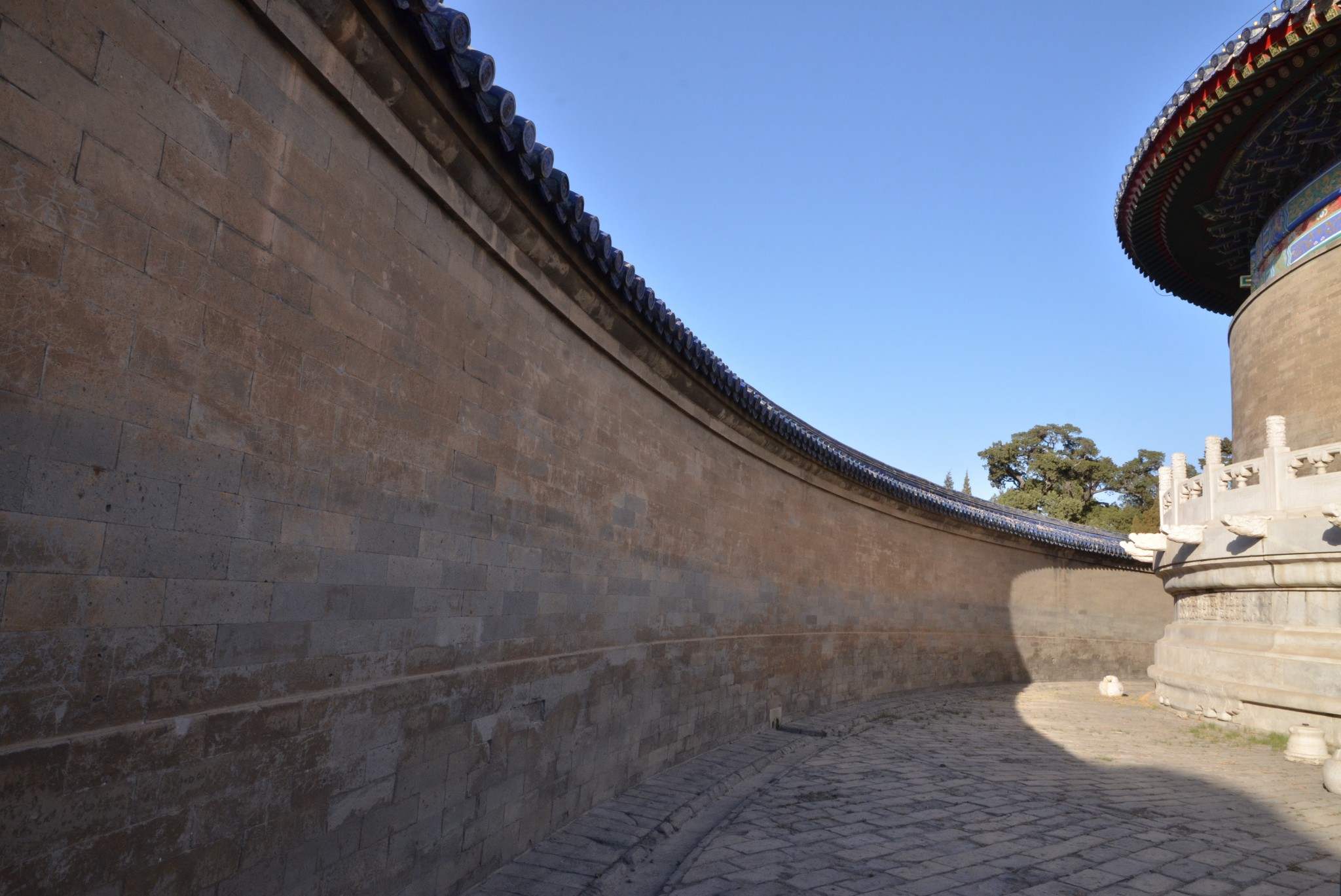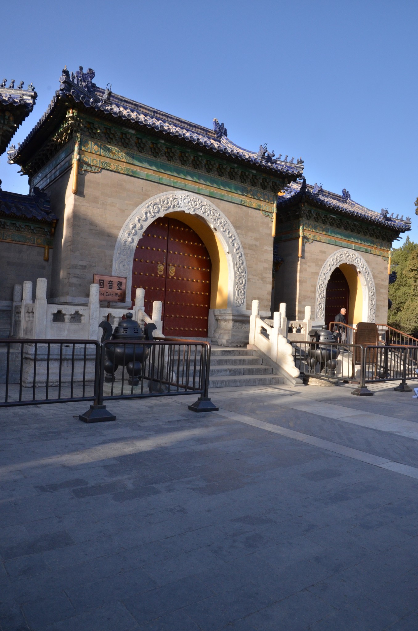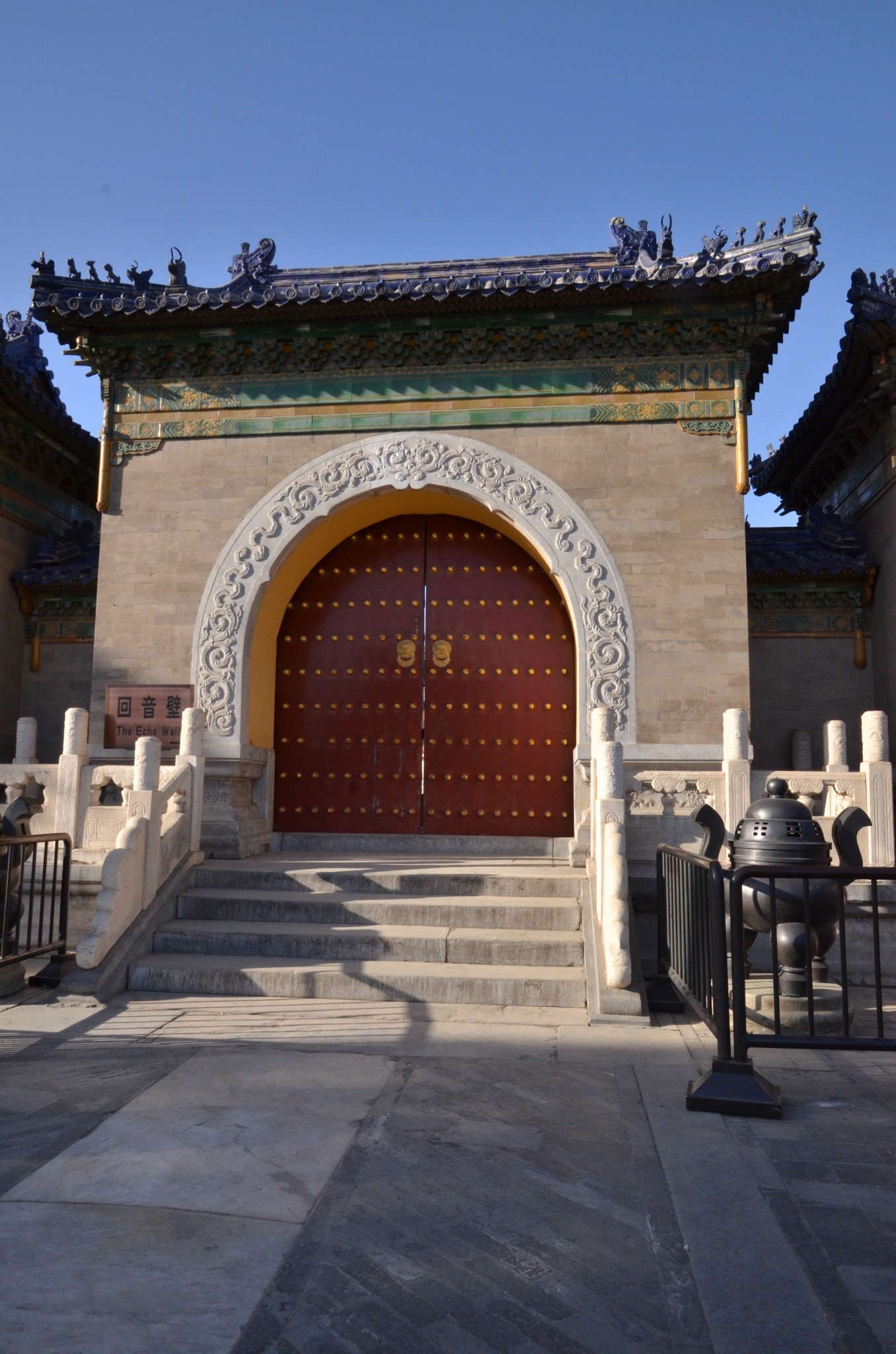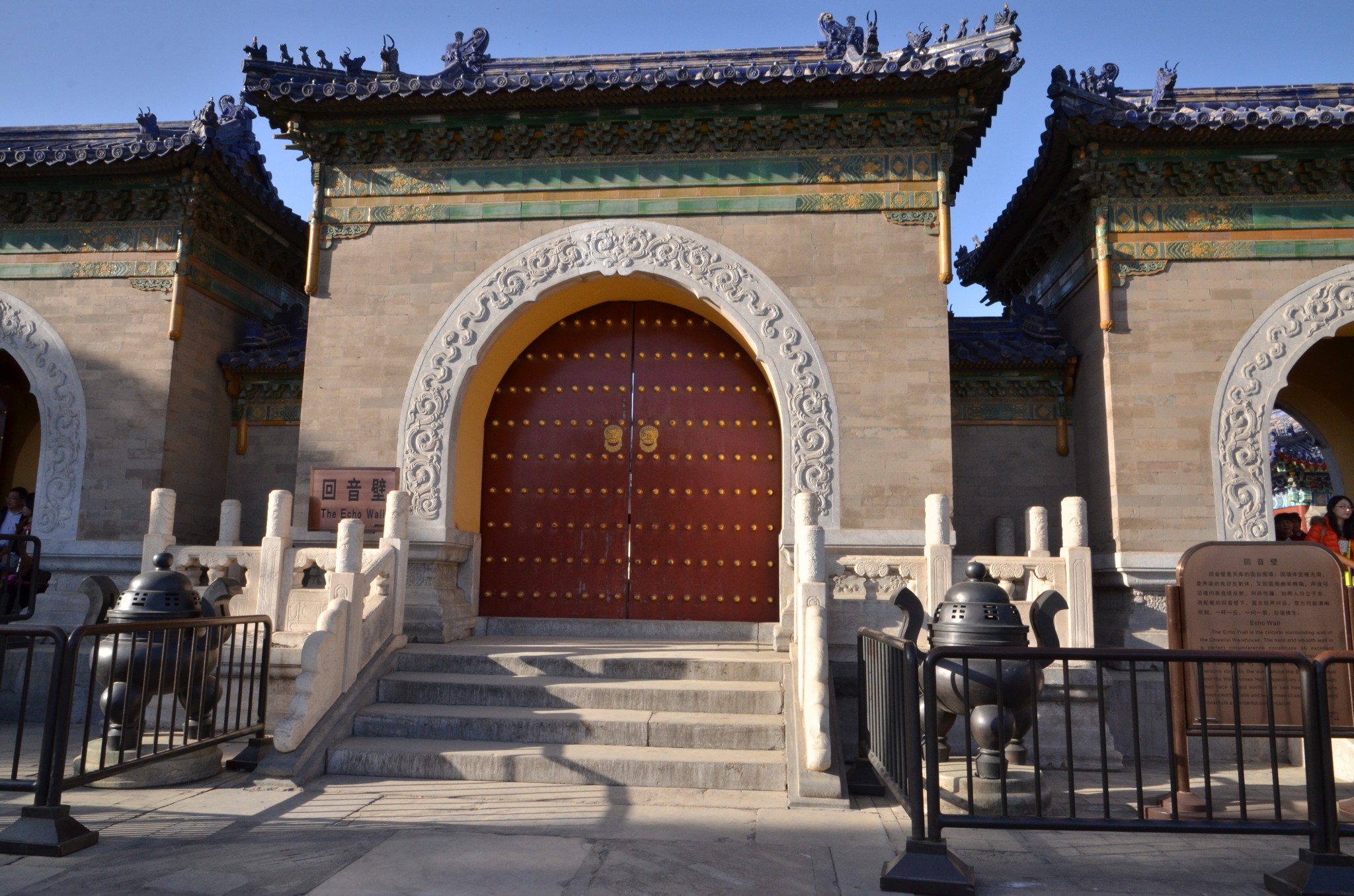 回音壁就是皇穹宇的围墙。墙高3.72米,厚0.9米,直径61.5米,周长193.2米。墙壁是用磨砖对缝砌成的,墙头覆着蓝色琉璃瓦。围墙的弧度十分规则,墙面极其光滑整齐,对声波的折射是十分规则的。只要两个人分别站在东、西配殿后,贴墙而立,一个人靠墙向北说话,声波就会沿着墙壁连续折射前进,传到一、二百米的另一端,无论说话声音多小,也可以使对方听得清清楚楚,而且声音悠长,堪称奇趣,给人造成一种“天人感应”的神秘气氛。所以称之为“回音壁”。