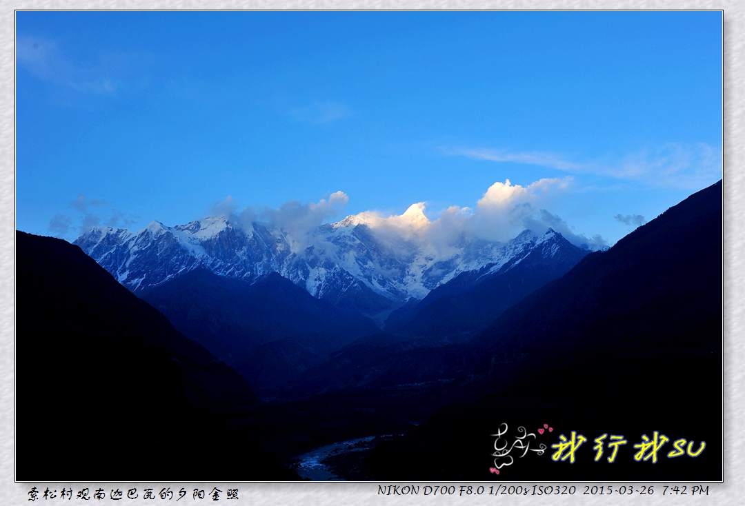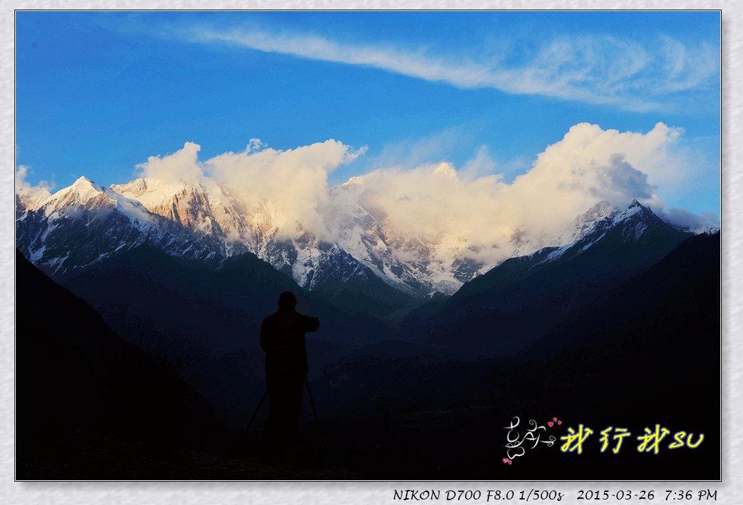 住在林芝派镇大峡谷索松村的两天,传说中神秘和羞祛的南迦巴瓦,傍晚时分总是会扯上面纱挡一挡羞红的俊脸。看见那个黑影了吗?那是我们神秘的特约领队赵老是也。
