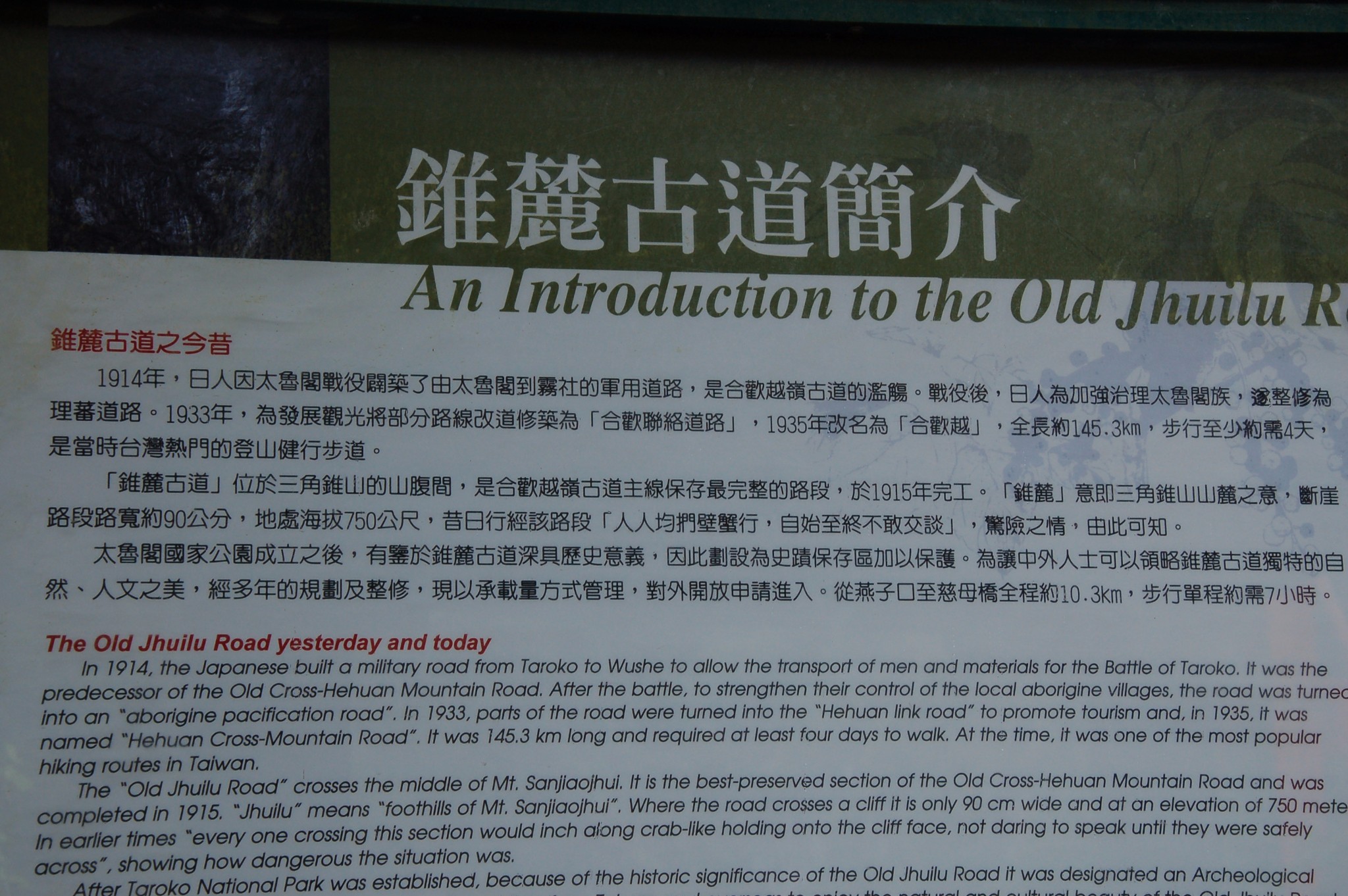 民國6年(西元1917年、大正6年)日本人強徵原住民壯丁,將小徑拓寬至1.5公尺,以便通行或載運火砲;壯丁們以繩索綑綁腰際,自斷崖頂垂懸而下,以鑿洞埋設炸藥,可見當年開鑿之艱辛危險。