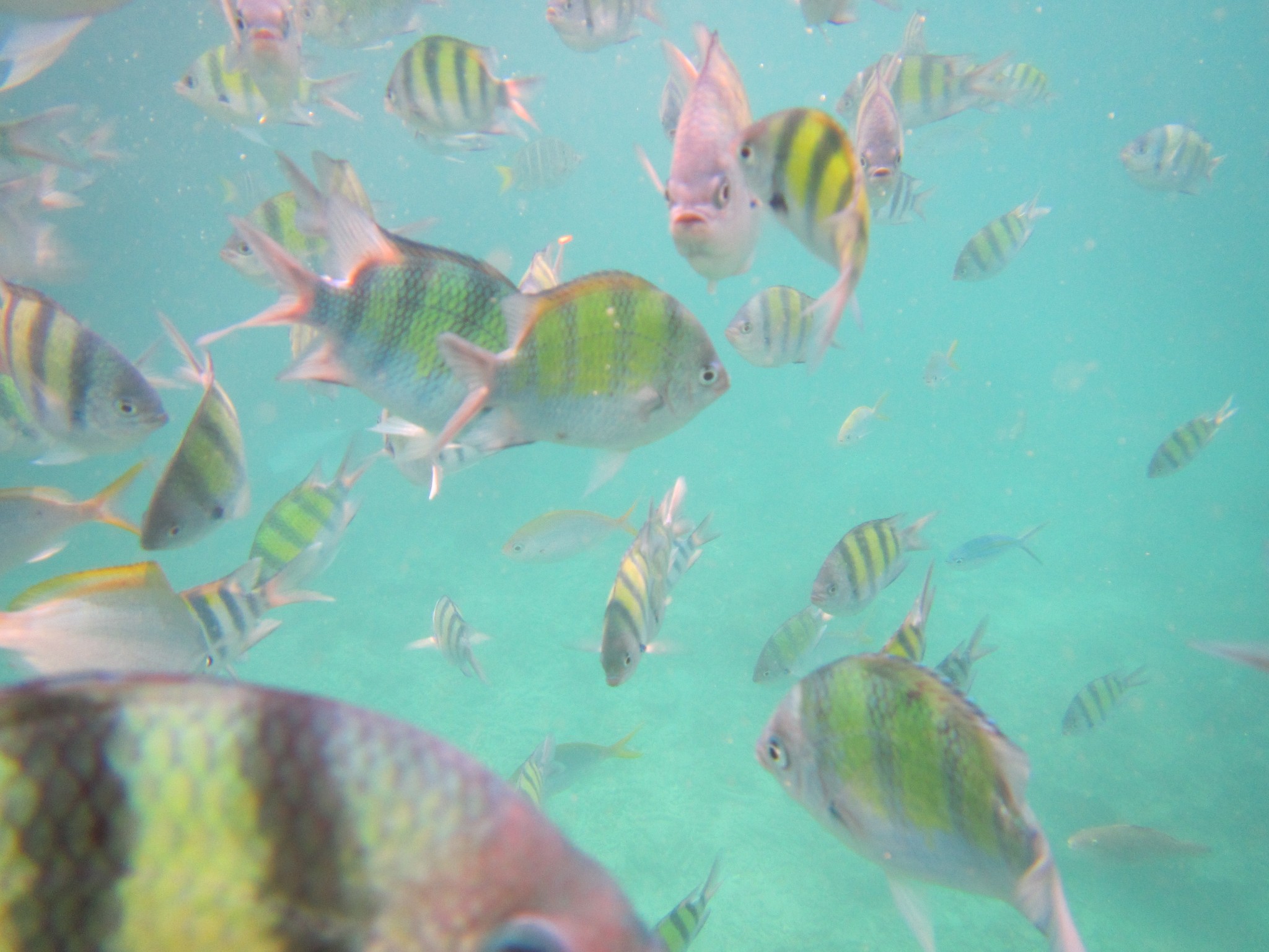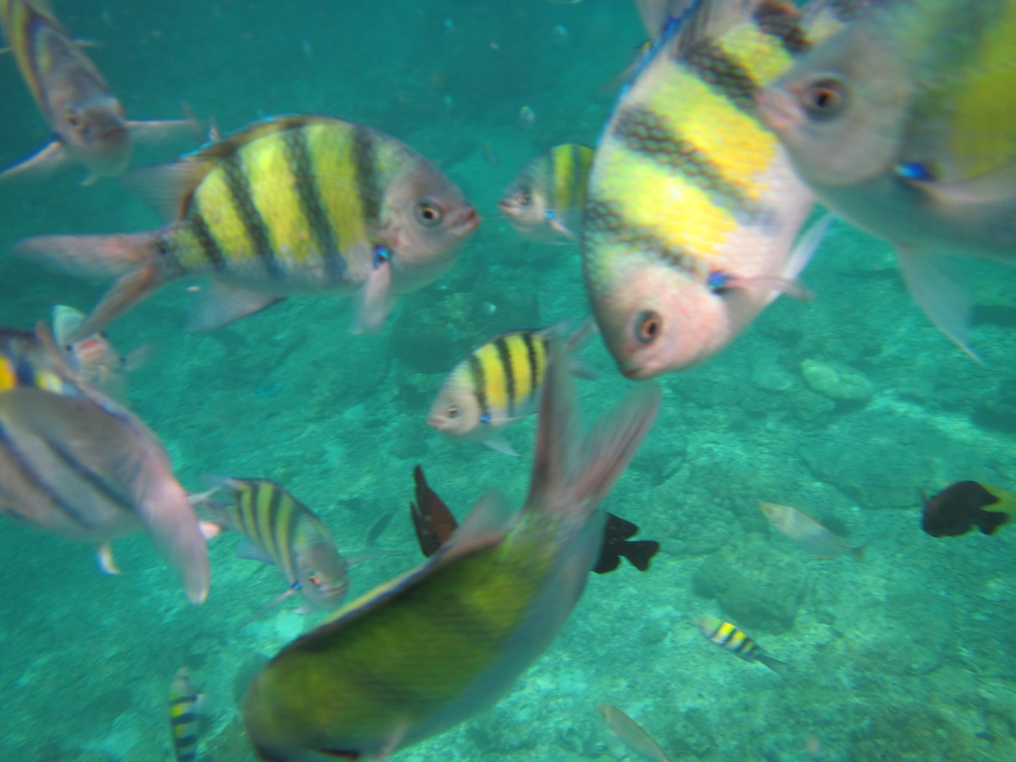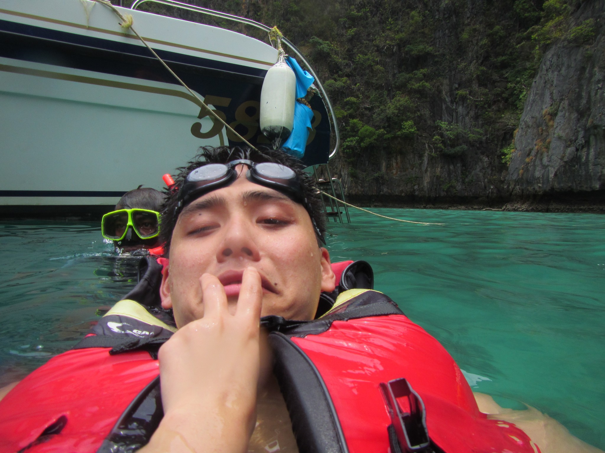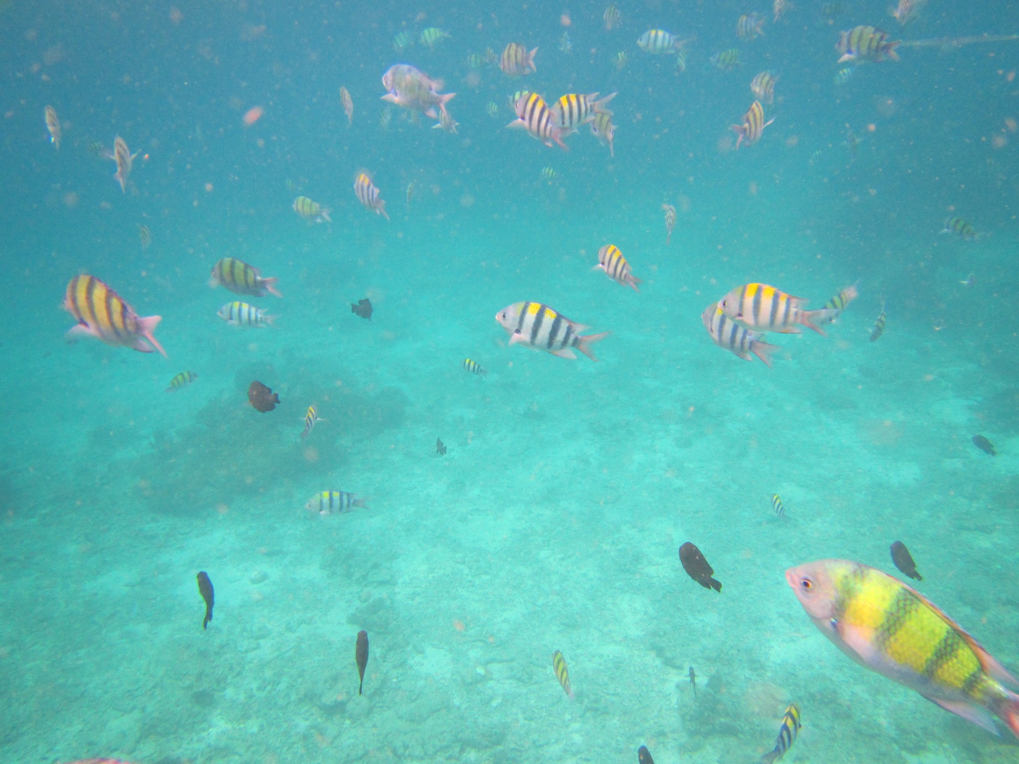 导游带我们去的那些浮潜地方,天堂湾啊,大堡礁啊,海水都不太干净,不过鱼还是挺多的,在上快艇之前我们自己买了一长带面包,20珠珠,那个是过期的,导游叫我们不要吃,自己不买也不要紧,船上有几带面包的,下去浮潜的时候会给你喂鱼。普吉岛的海水超级咸,呛到之后感觉就要咸死了,我下去浮潜的时候不是抓着阿三,就是抓着救生圈,虽然救身衣也是穿着的,但是不会游泳还是会呛到水,上次马代学的游泳圈忘记了。后悔的就是上次去马代没有租借水下相机,马代的海水干净,也没那么咸,鱼的品种也比较多。不过,马代的海里是禁止游客给鱼喂食物的,所以他们那里的海水比较干净吧。