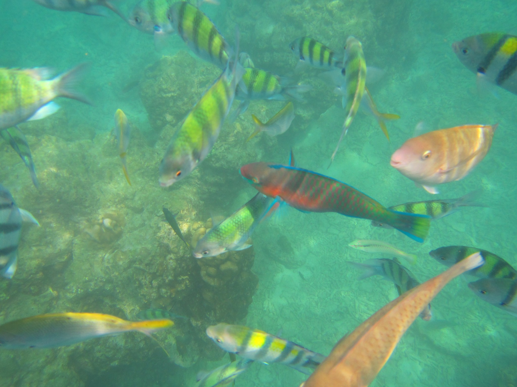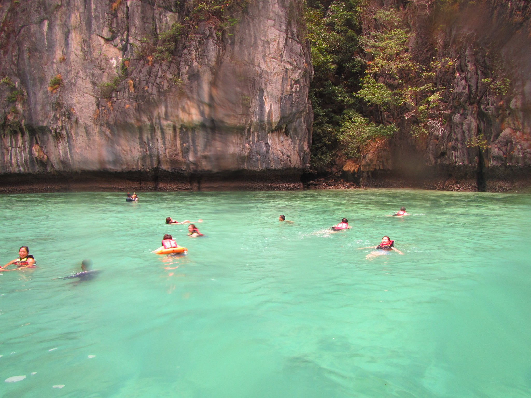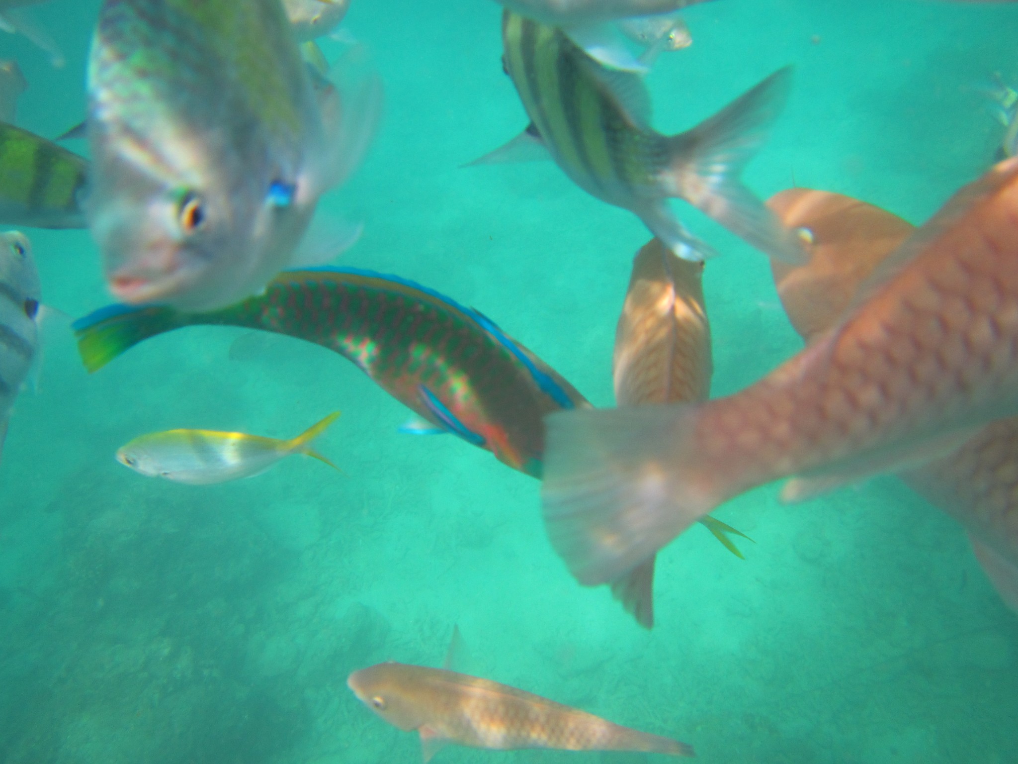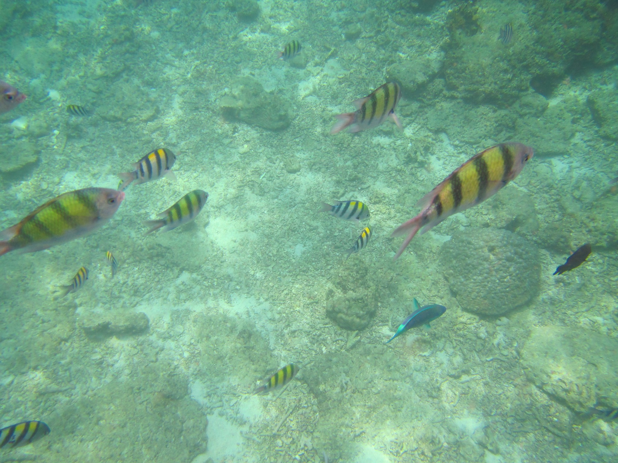 导游带我们去的那些浮潜地方,天堂湾啊,大堡礁啊,海水都不太干净,不过鱼还是挺多的,在上快艇之前我们自己买了一长带面包,20珠珠,那个是过期的,导游叫我们不要吃,自己不买也不要紧,船上有几带面包的,下去浮潜的时候会给你喂鱼。普吉岛的海水超级咸,呛到之后感觉就要咸死了,我下去浮潜的时候不是抓着阿三,就是抓着救生圈,虽然救身衣也是穿着的,但是不会游泳还是会呛到水,上次马代学的游泳圈忘记了。后悔的就是上次去马代没有租借水下相机,马代的海水干净,也没那么咸,鱼的品种也比较多。不过,马代的海里是禁止游客给鱼喂食物的,所以他们那里的海水比较干净吧。