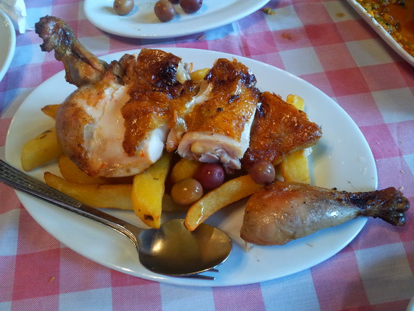 葡国鸡,皮好吃,脆、香,皮以下的部分味淡肉柴。但配的薯条却是超级美味,外脆里糯粉粉甜甜的。