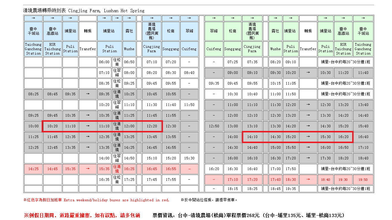 实际上,台中到清境也是两段,即台中-埔里,埔里-清境,这样的单程票价加起来是NT272/人。