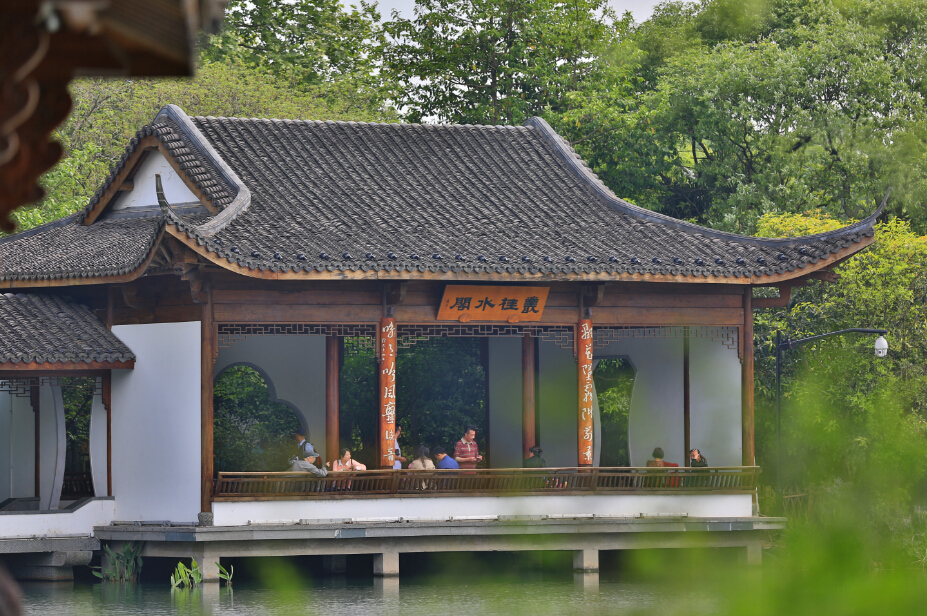 第二天,是难得的好天气,一大早伯父就告诉我,“你呀,来的时间真好,不冷不热、又是五一前,游人少很多”。是的呀,4月的杭州是最好的,最能显示出她的魅力。由于前一晚的大风,雾霾几乎都随风飘散了。这一天,二姐休息,便驱车带上我们去几个景区,再去杭州比较有特色的餐馆【江南驿】用餐。第一站便是杨公堤,一座亭台楼阁藏于绿荫山水之间,这便是我爱上杭州的开始,也是从这一天开始慢慢懂得为什么白乐天最忆的是杭州。