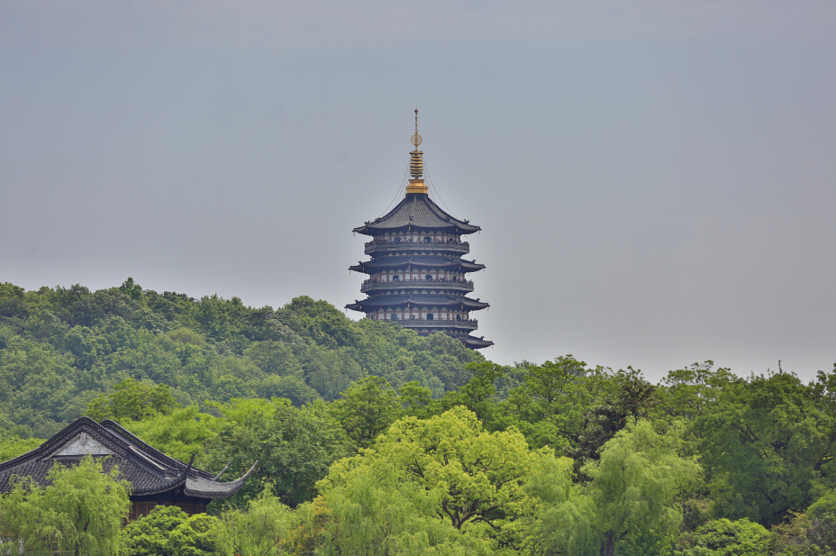 第二天的将近中午时,我们又绕回到了花港观鱼附近,在南湖这儿清清楚楚地凝视着雷峰塔,好像雷峰塔真会倒下来一般。传说是吴越王钱弘俶为庆祝宠妃黄氏得子而建,昔亦称黄妃塔。“雷峰”之名则取自所处的杭州南岸夕照山之最高峰——雷峰顶上。1924年倒塌,2002年重建。关于雷锋塔最著名的传说莫过于北宋时期的《白蛇传》——法海大师于此收白素贞。