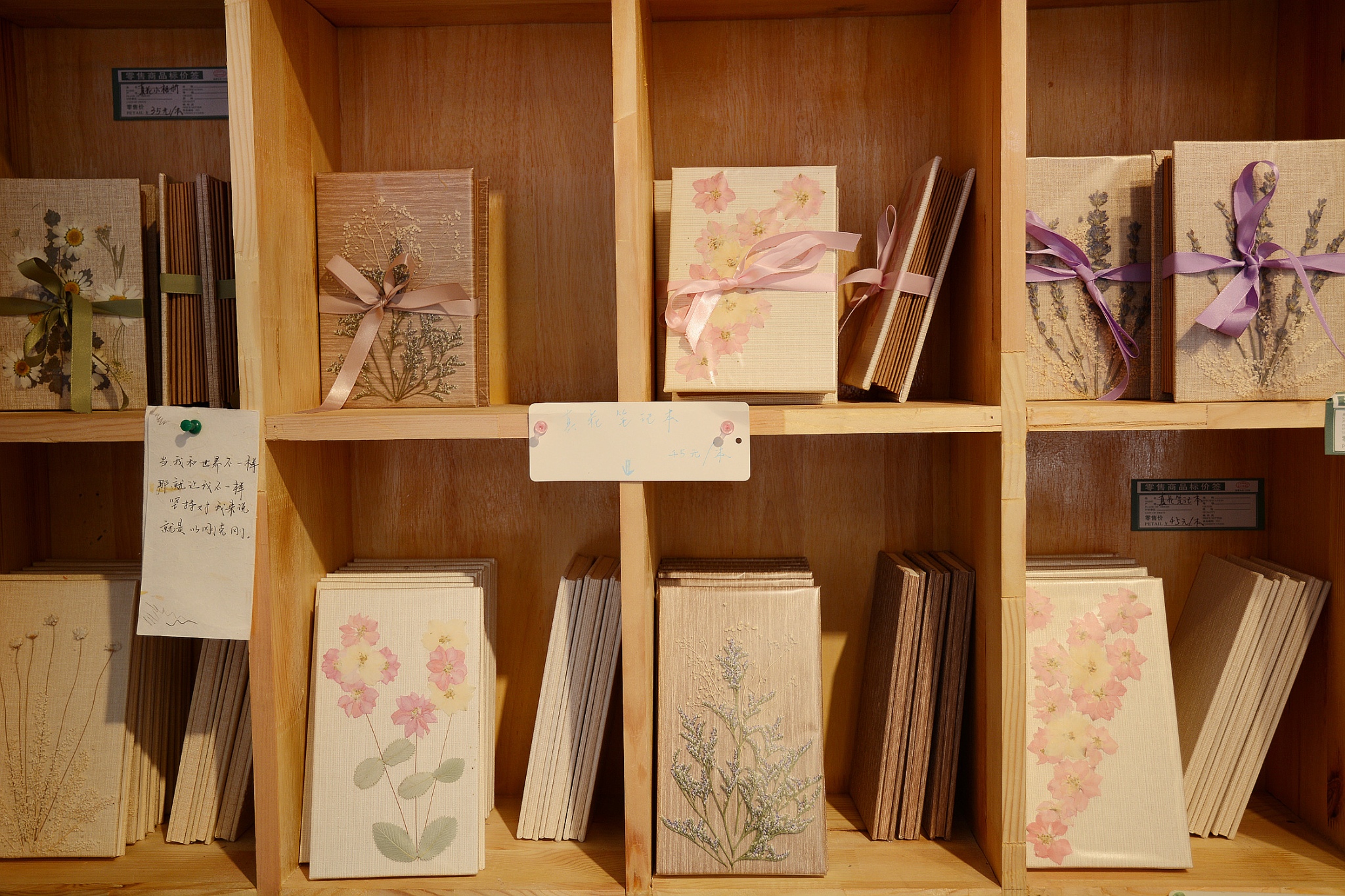 真花笔记本,把花朵风干以后用作装饰,45一本,不便宜。我买了一个真花明信片,15。