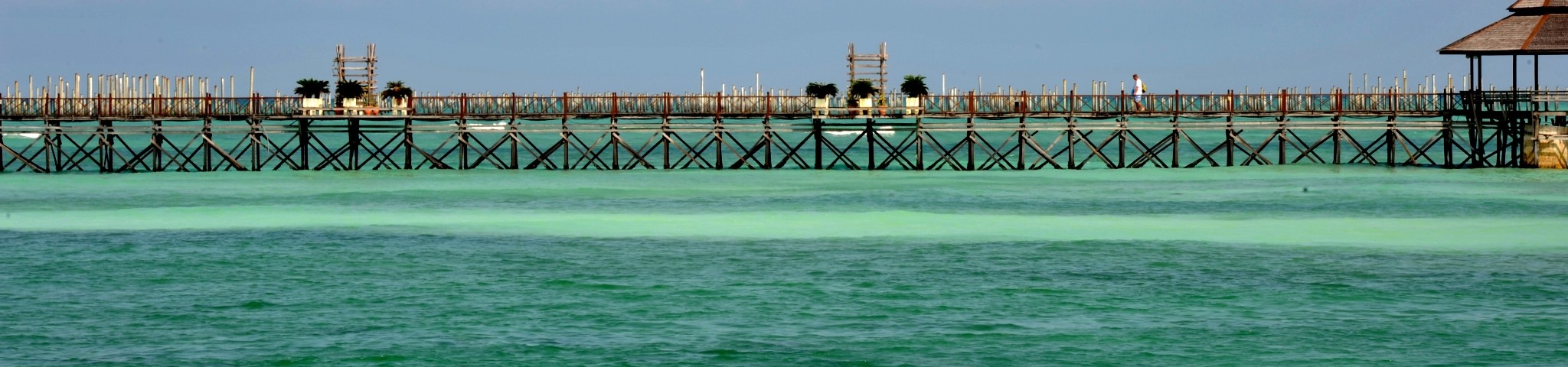 待人齊了之後,我們的行李已經被工作人員拿到船上了。我們沿著常常的廊橋向盡頭走去,兩側是很多一個個的房子,潛店居多,門口的海報基本都有中文。再遠處是一些破破爛爛的岸邊高腳水屋,衛生狀況也不好。這次是分坐兩條快艇上島,我們艇上除了船長還有一個會講點兒中文的中年大叔,但是大叔很靦腆,不大說話。