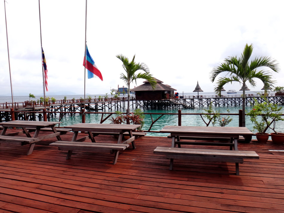 突然間我發現,平台上的三個旗桿上有兩面旗子,一面是馬來西亞國旗,一面是沙巴州的州旗,均掛半旗,這是為MH370失聯人員而降的。心中總想着有朝一日,迷失的航班會出現在大家的面前,哪怕我們已至耄耋他們仍然年少。