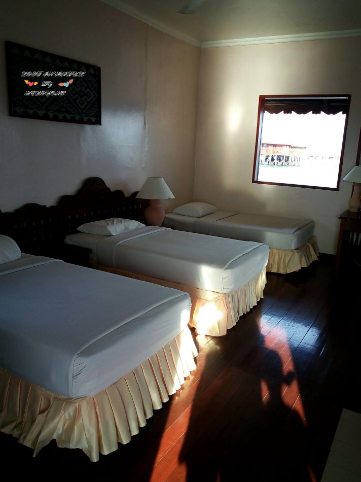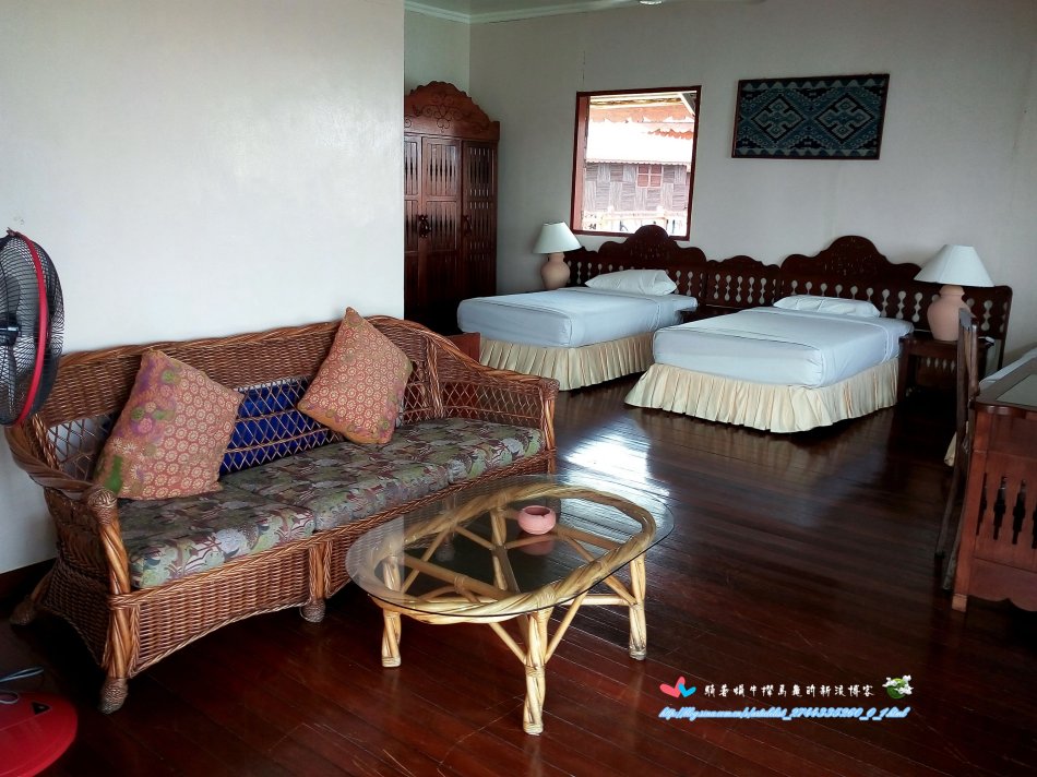 打開門一看,房间挺陳舊,設施跟服務跟熱浪島相比,有一定的差距。進門左邊擺著三張單人床,床墊子很軟,最靠近大門的床頭上面有一個窗戶(一個暴雨的夜晚,可憐的老屋同志被雨水淋醒了。即便關上窗,也還是有雨霧從窗棱處飄進來),最裡面的那張床側面也有一個窗戶,窗邊是一張桌子,窗外就是我們的陽台,桌子旁邊算是會客廳吧,擺著一長一短兩張籐編沙發一個籐編茶几,還有一個電風扇。正對著是兩扇可以推拉的折疊木頭大門,門外是陽台,放著兩張躺椅,陽台是一長溜兒,跟屋子的寬度是一樣長的,靠海的角落裡放著一盆綠色植物,靠近木棧道內側是一個晾衣架。