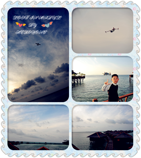正當我想從瞭望塔上下來的時候,聽到了嗡嗡的聲音,抬頭望去,一架水上飛機,向著我們飛來,應該是水上巡邏機吧。是不是因為前段時間的各種不安定事件,馬來西亞警察部隊加強了對菲律賓邊境的巡邏呢。可能看到瞭望塔上有人,飛機直接衝着我飛了過來,下了我一跳,總覺得腳底下不實落。我放下相機,向飛機招手。當時有這麼個畫面:靜悄悄的清晨,海天相接的地方,一架紅白相間的水上飛機正向水屋瞭望塔飛去,塔上,一個傻乎乎的老男人忐忑不安的對著一架飛機揮手,估計在飛行員在飛機上看我如螻蟻一般的渺小。或許是飛行員在靜寂早晨也是很無聊吧,他飛來飛去繞著瞭望塔飛了五六圈,哥做廣播體操似的揮了很長時間手,還別說,揮完手,腰不酸了,腿不疼了,心臟也不忐忑了,一口氣下到一樓,要想身體好,馬布去揮手。