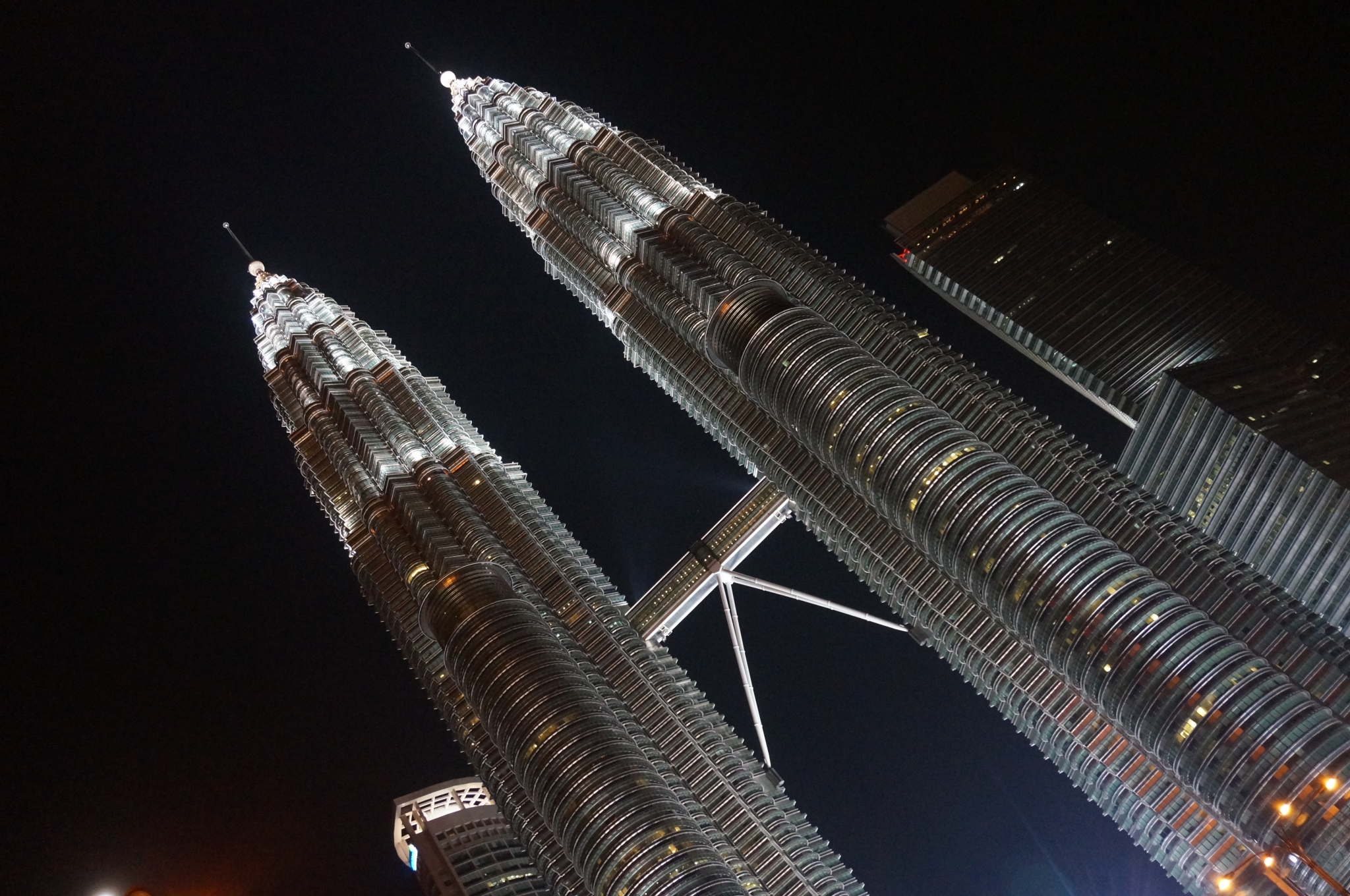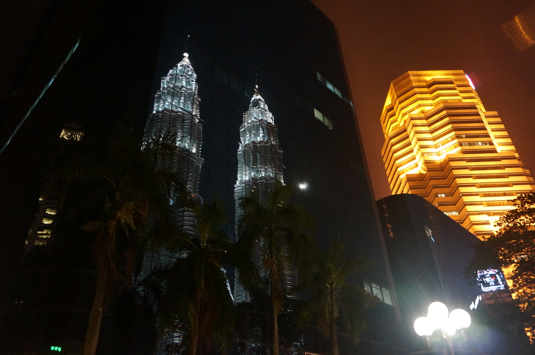 回去的路上去了AEON超市,发现便利店至少2RM的纯净水在超市只要0.4RM, 水果的价钱也不算贵,果断拎了8瓶水回Hotel...回到稍作休息,步行前往双子星塔看夜景。沿路去了一家露天的类似大排档的地方吃晚饭。三四家小店共用一些露天桌椅,点了其中一家的鱼肉饭和鸡肉饭,点了另一家的烧烤,还有果汁铺的鲜榨果汁。味道都挺好的,价格也实惠,算是当地人吃饭的地方了,旅途中第一次,瞥到了一丢丢马来西亚物价低的实例~夜晚的双子星塔在这座城市里显得无比耀眼,通透,恢弘。虽然白天进到大厦里面有那么一点点鄙夷这个建筑与整座城市不怎么协调的那种Stupid Rich,但我承认看到夜晚的双子星塔,还是挺兴奋挺震撼的。和双子星塔隔着马路相对的一栋大楼的玻璃上竟然映射出完整的双子星塔,太奇妙了!