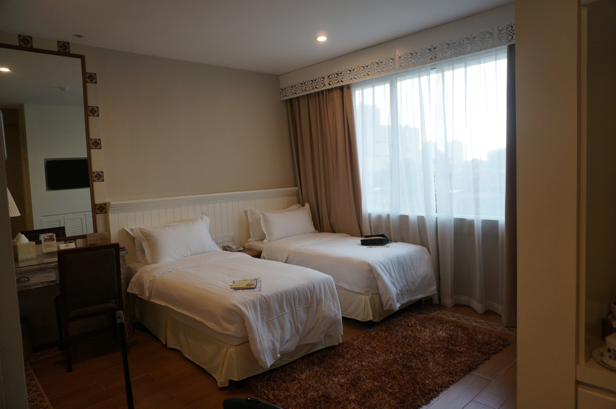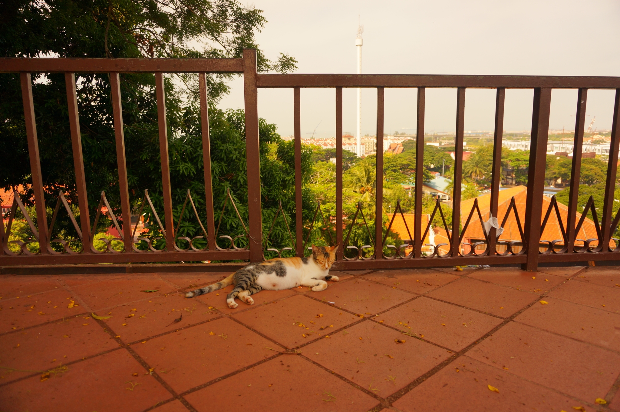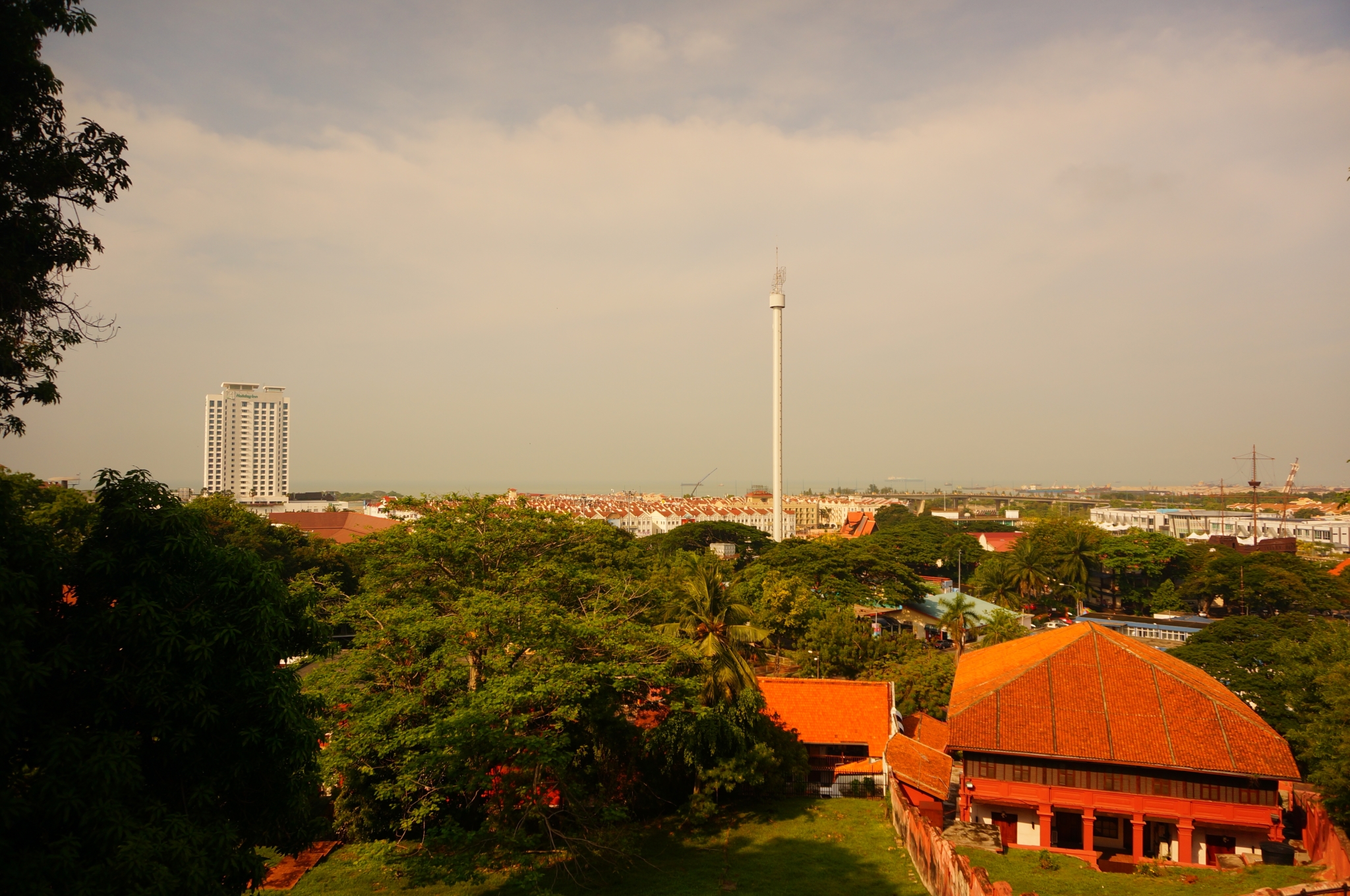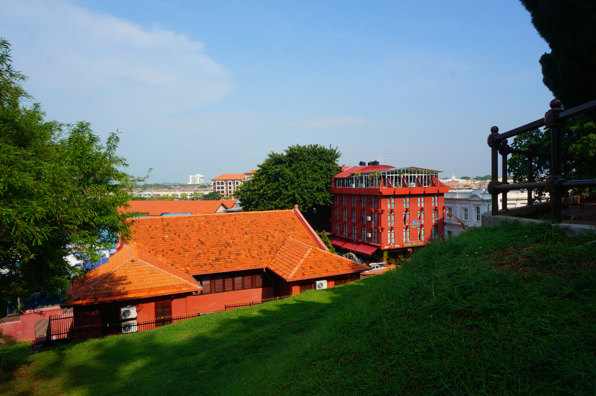 从Tune Hotel乘坐轨道交通到Tasek Selatan站,在南湖镇车站(TBS)乘坐大巴前往马六甲中央车站,历时约2小时,车票是40RM每人,购票时需要出示护照。等车时又来了一场大暴雨,还好我们的班车没有延误。一路上沿途风景很漂亮,雨后的万里晴空,路两边的葱郁树木,一派清新的、生机勃勃的热带风景,哈~满满的度假Feel。到了马六甲中央车站后,有一个出租车购票点,在那里买票后乘车。根据经验,在马来西亚通过出租车购票点买票,或者车上打表,再或者是Hotel帮忙叫车,都是比较令人放心的,价格也公道。如果是自己在路边打车,告诉司机目的地后最好先问一下价钱,避免下车时面临"狮子大开口"又无奈“眼泪掉下来”。在马六甲的住宿,我们是在Agoda上订的The Settlement Hotel (双人间每晚300多人民币),在吉隆坡感受了两晚简陋的Tune Hotel之后,我们对下一站马六甲期待满满,主要原因可能就是这家五星Hotel...从环境设施到酒店服务,果然不负众望啊。院子的草坪旁还有个白色鸟笼状秋千,快让我第一时间去摇啊摇晃啊晃