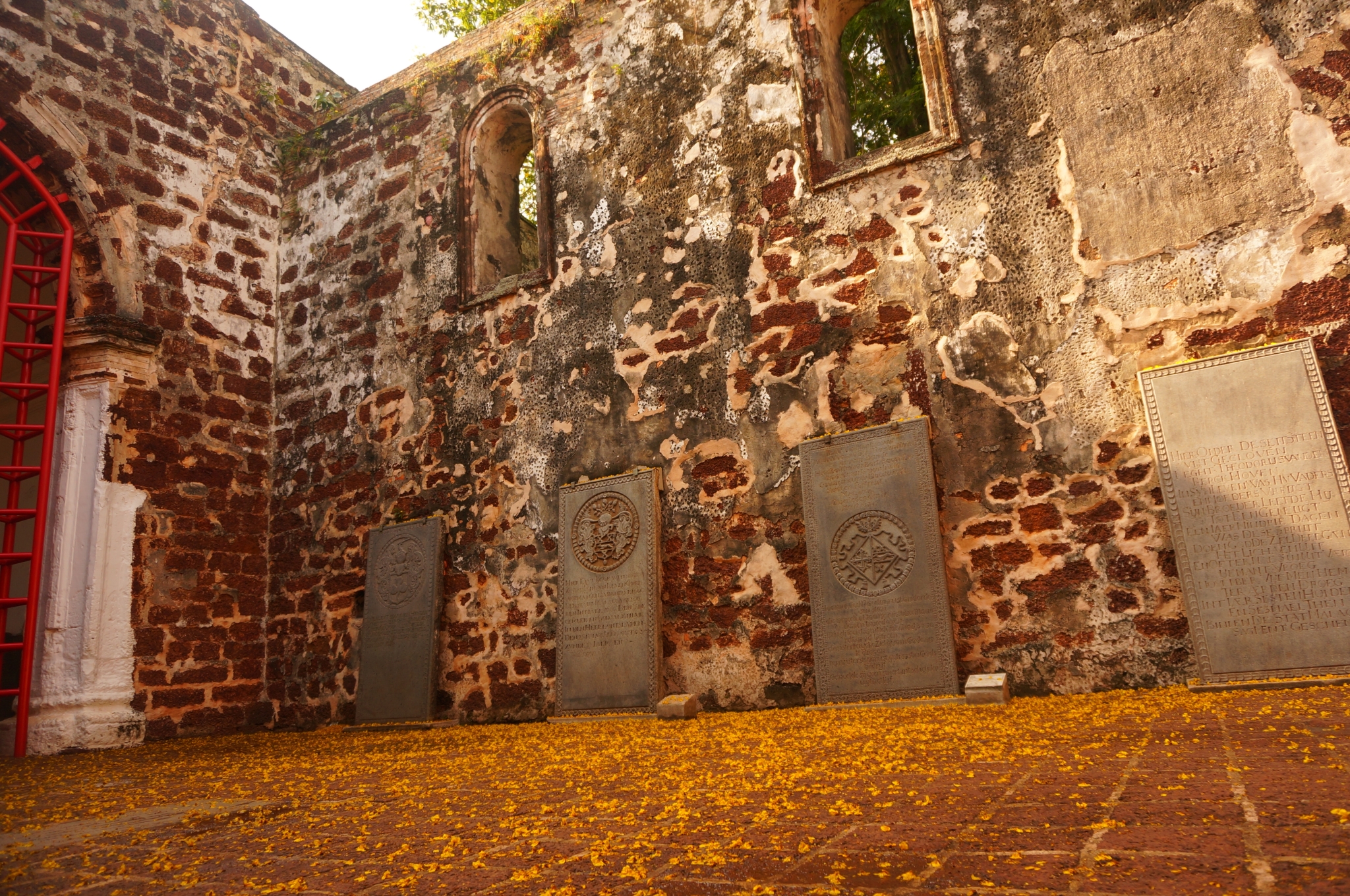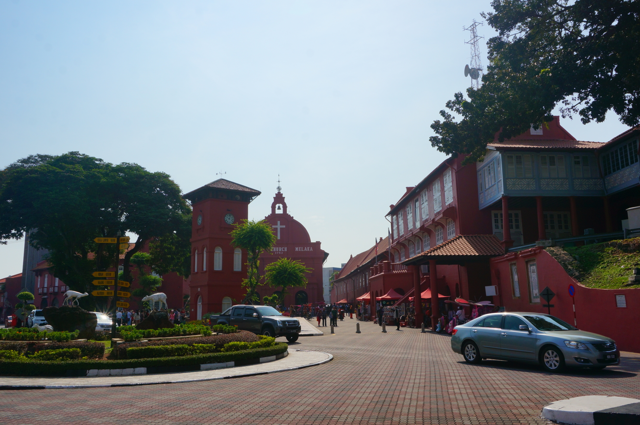 马六甲的清晨~Hotel附近是葡萄牙人聚集地,原以为会有什么特色民风可以参观一下,步行过去除了一间伊斯兰教堂也没发现什么特别的,就在附近找了家类似大排档摆设的餐馆吃当地特色的早餐,之后在槟城也看到有类似的排档,一个挺大的空间里摆了很多桌椅,旁边有各家独立经营的不同种类的餐食档口,这种排挡一般都会要求顾客必须点一杯喝的,你刚坐下,就会有饮品摊位的人来问你喝啥呦。我们点了米饭配菜,鱼片粥和板面。除了貌似是隔夜米饭做出来的粥之外,其他都挺好吃的。吃过早餐,Taxi(18RM) 前往荷兰红屋——马六甲的地标所在,周边还有一些富有韵味的历史遗址,都可以步行参观。