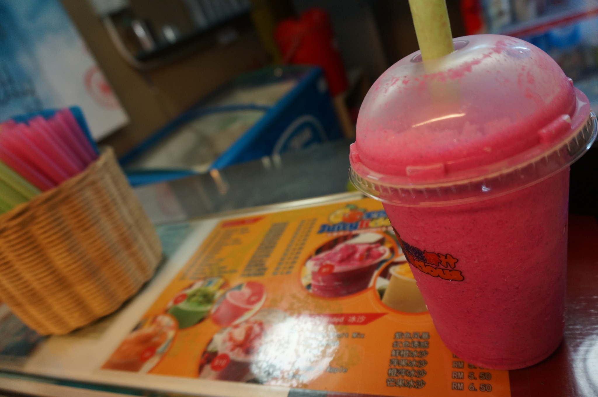 在马来的这几天,每次闲走几步,LL同学就会号召:我们找个地方坐下来喝点东西吧。看吧,“好逸恶劳&贪图享受”木有错吧,这次也一样。刚好姓周桥有一家饮品小店,果汁Mix乳酪特别好喝。