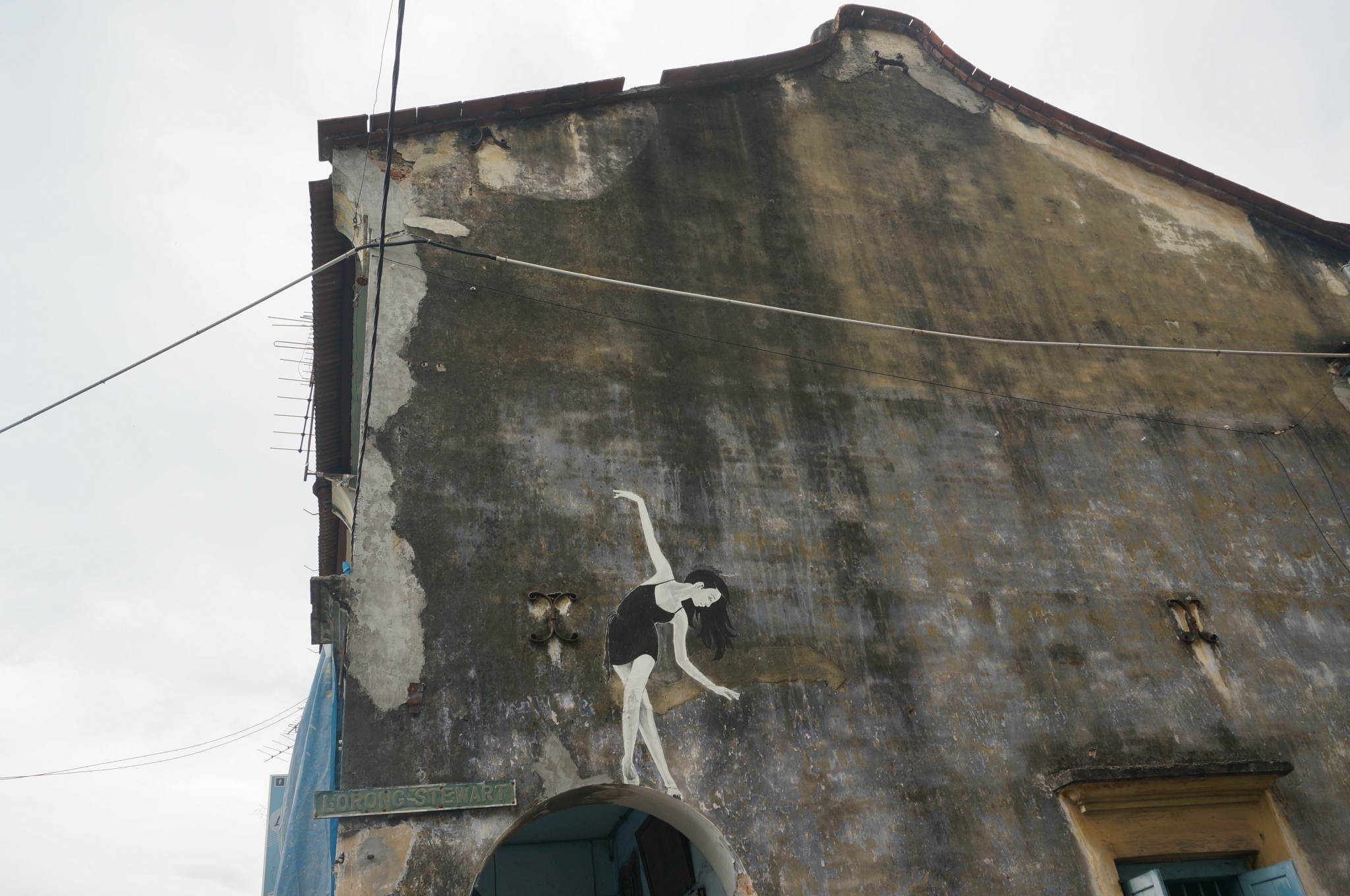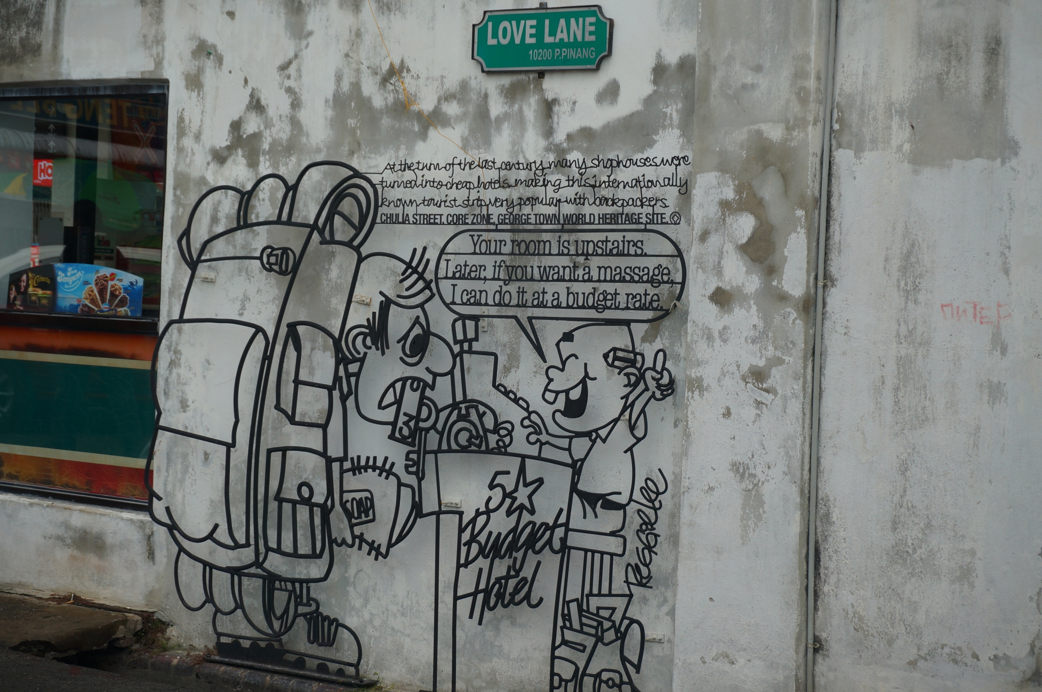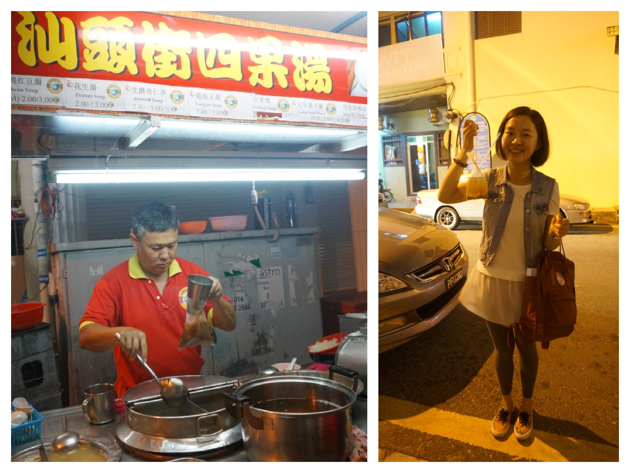 出了姓周桥,我们就去找汕头街。旅游淡季,除了一些夜市排档,街道上都冷冷清清的。即使到了攻略中被频频提到的美食聚集地汕头街,也没有想象中的人头攒动。每人买了一份看起来很受欢迎的四果汤,由于源自《初恋红豆冰》中袋装薏米水/红豆冰情结,我带动大家都选择了袋装的四果汤,于是就出现了后来大伙儿站在别人屋檐下躲着车扯开塑料袋吃卡在吸管下的莲子桂圆白果的狼狈画面,当初用盒子装不是更好吗?我的错,怪我森森的袋装饮品情结...惊喜的是,一路上偶遇了很多乔治城的经典壁画。