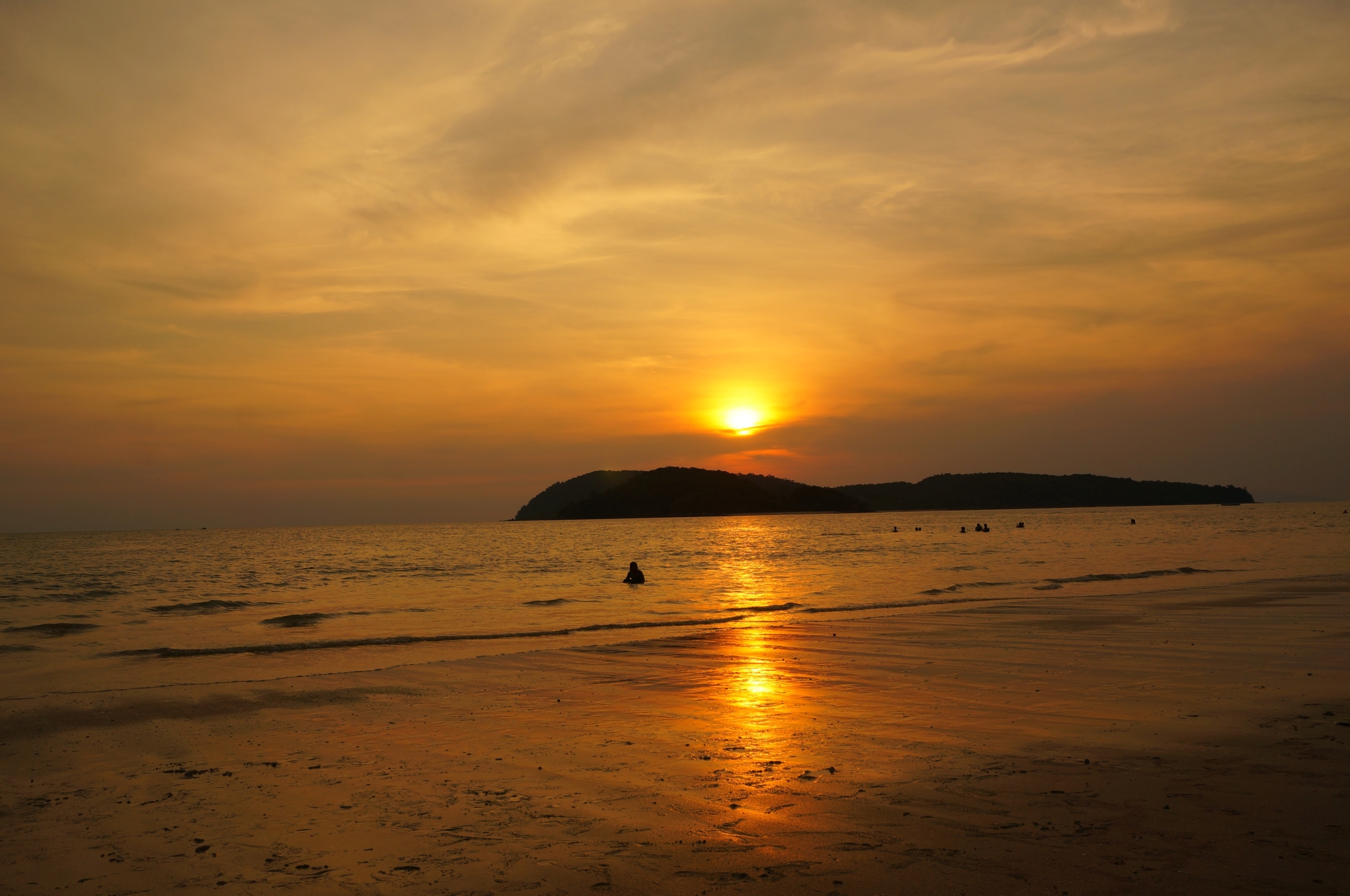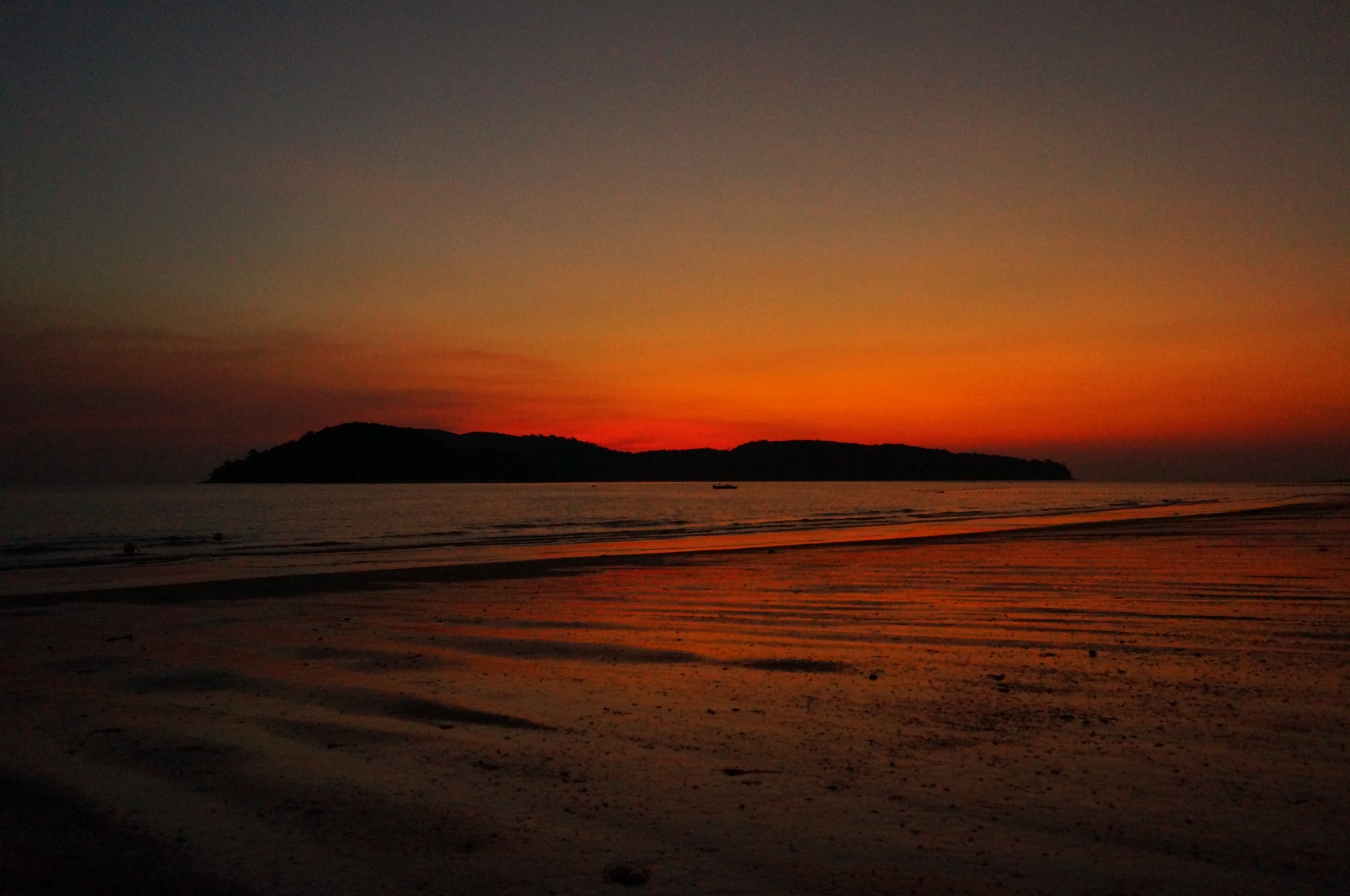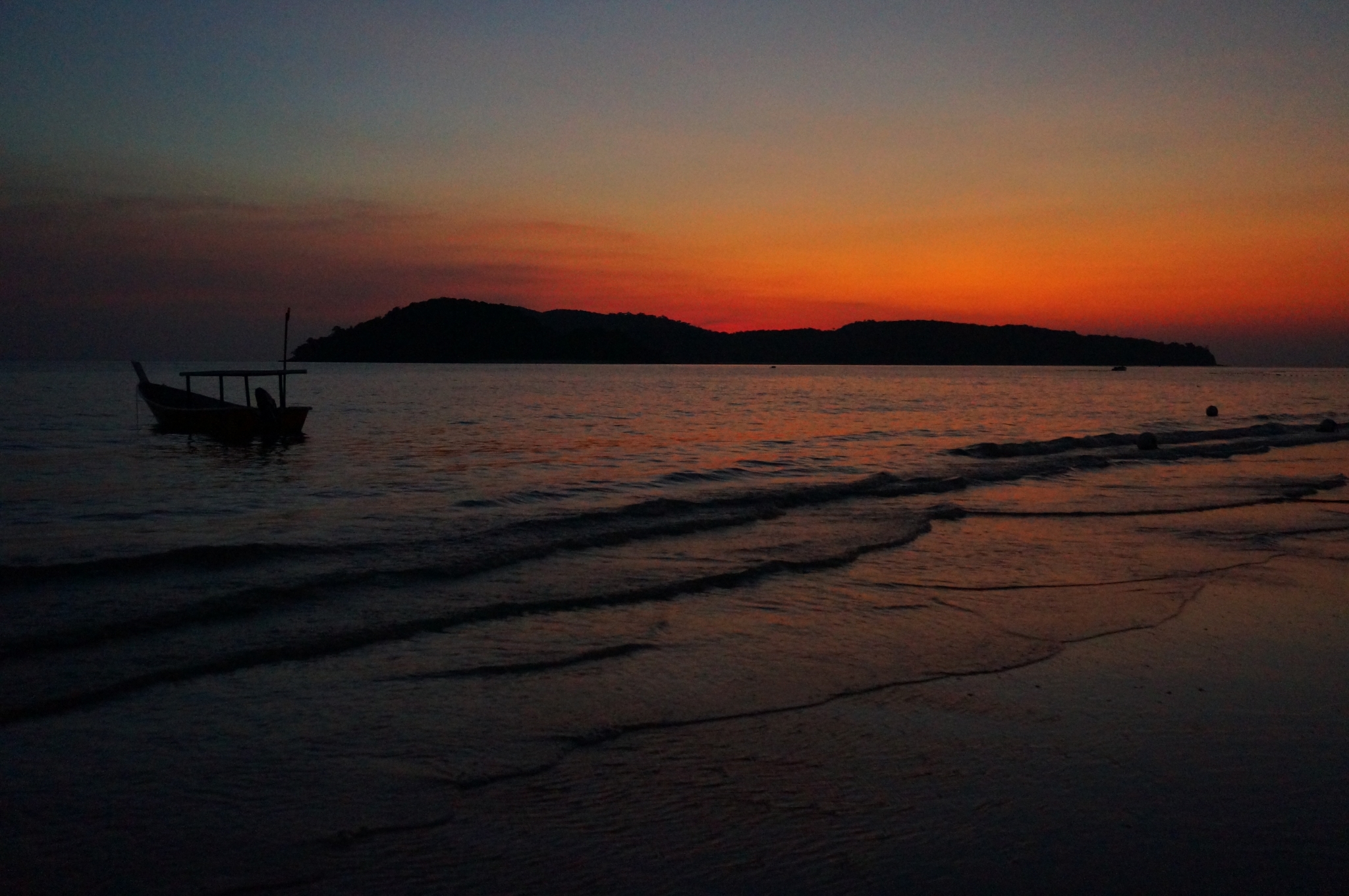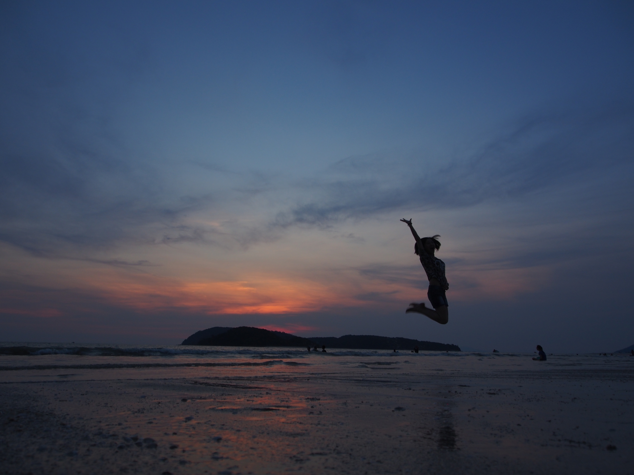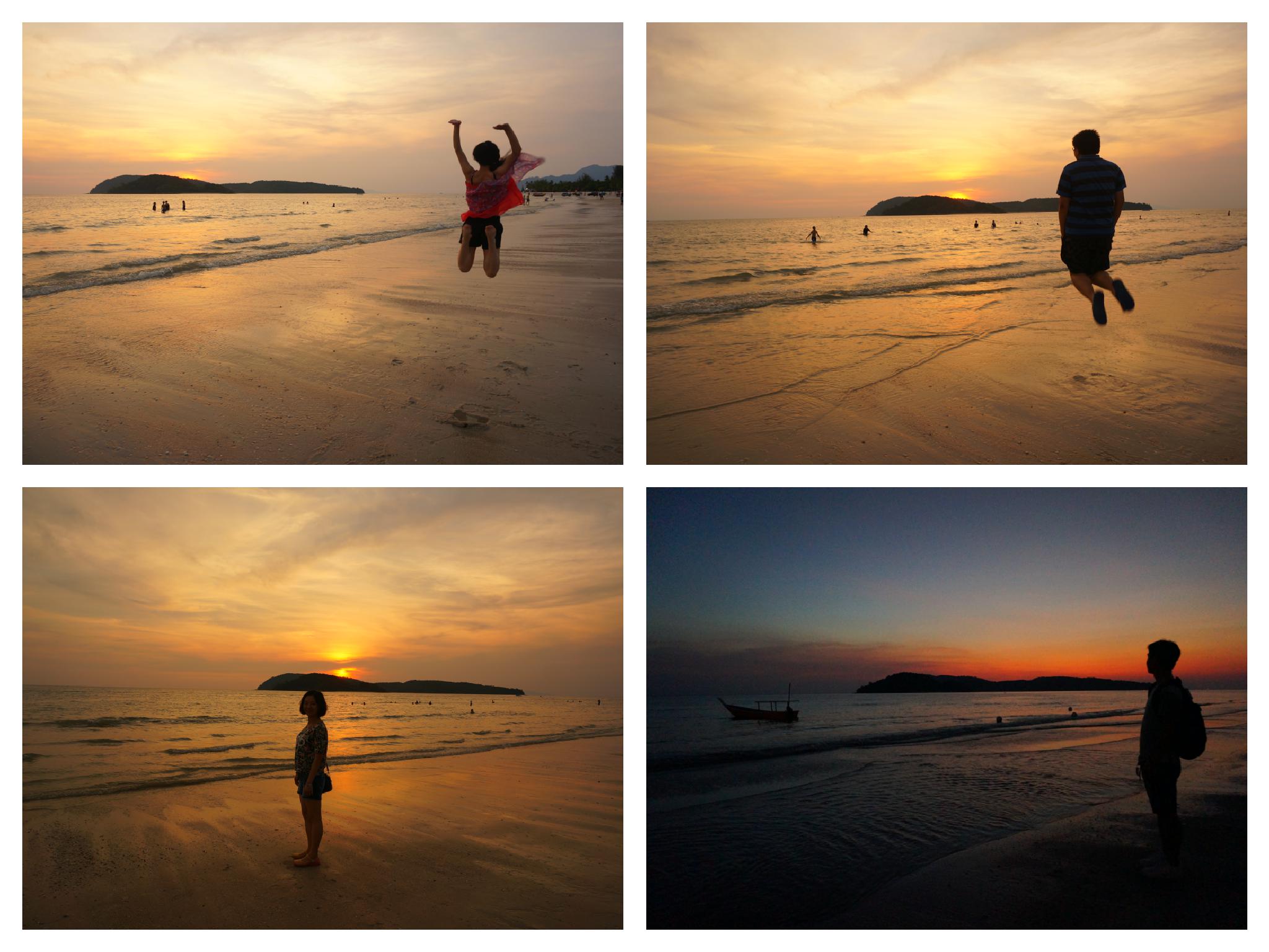酒足饭饱,走去附近的珍南海滩散散步。右拐穿过一家Hotel和餐厅的夹道,一抬眼发现夕阳染红了半边天,真是个惊喜的礼物!意料之外的美好啊!整个海滩,远处的小山,飘在海面的渔船,都带着金边浸染在这一片红色中。这里的沙滩细软干净,绵延宽阔,赶紧拿出相机记录这稍纵即逝的美好,拍着拍着,天色就暗了下来,夜空里繁星点点。在不同城市辗转求学这些年,满天繁星只是童年时乡下夏夜留给我的美好回忆了。星辰大海,就在这一刻的眼前。